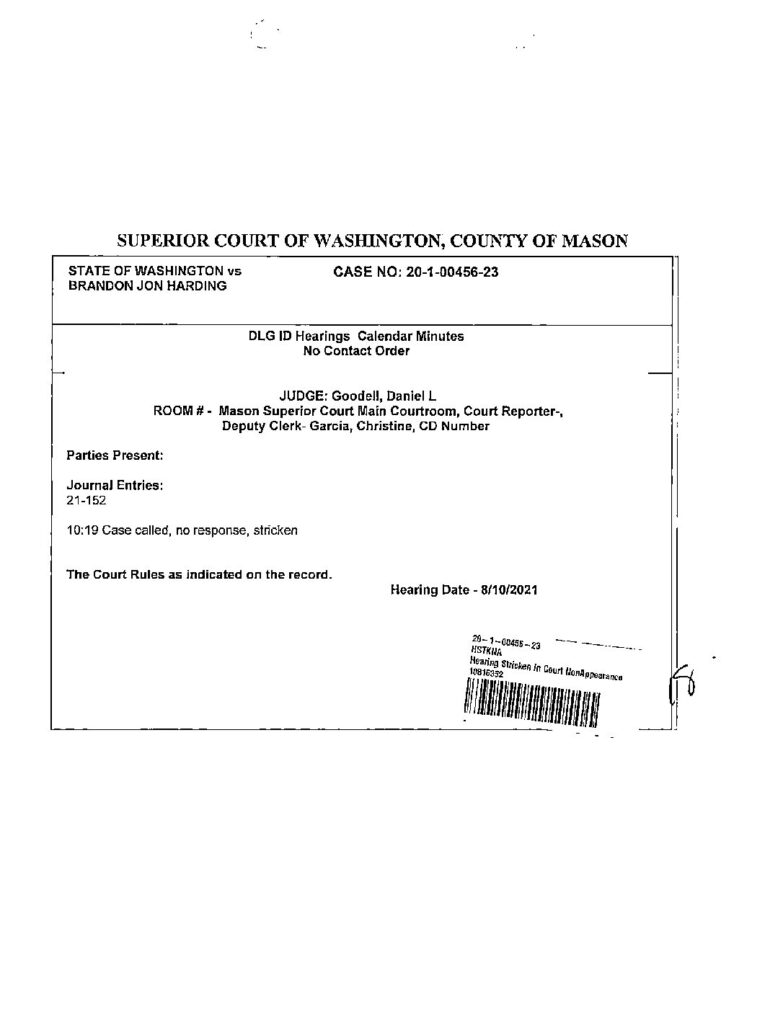 Held Parties PresentPlaintiff (Criminal): STATE OF WASHINGTONDeputy Prosecuting Attorney: Bickerton, Tyler Craig Defendant (WIP): HARDING, BRANDON JON - 10 12/28/2020 No Contact Order View Document Order for Sexual Assault Protection Judicial Officer