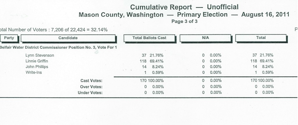Shelton residents are on the verge of losing all they gained in recently defeating Adage & biomassacre proponents. By failing to pay sufficient attention to local political machinations, and now by casting incredibly few ballots in the primary, candidates who stonewall voters (or side with corporate special interests outright) when asked their position on environmental protection as well as community health and quality of life are poised to assume office as Mayor of Shelton (Dawn Pannell) and Port of Shelton Commissioner (Dick Taylor).