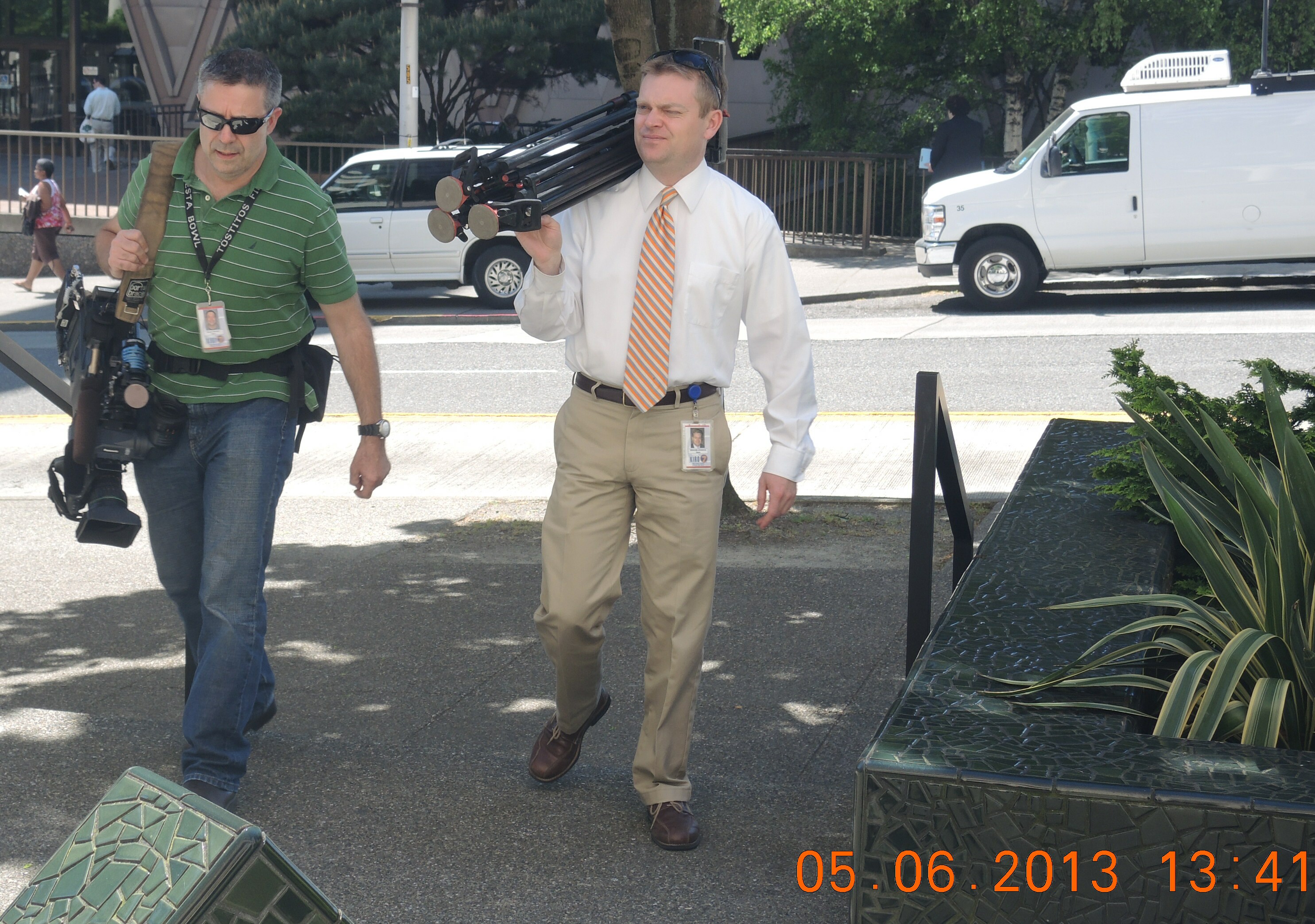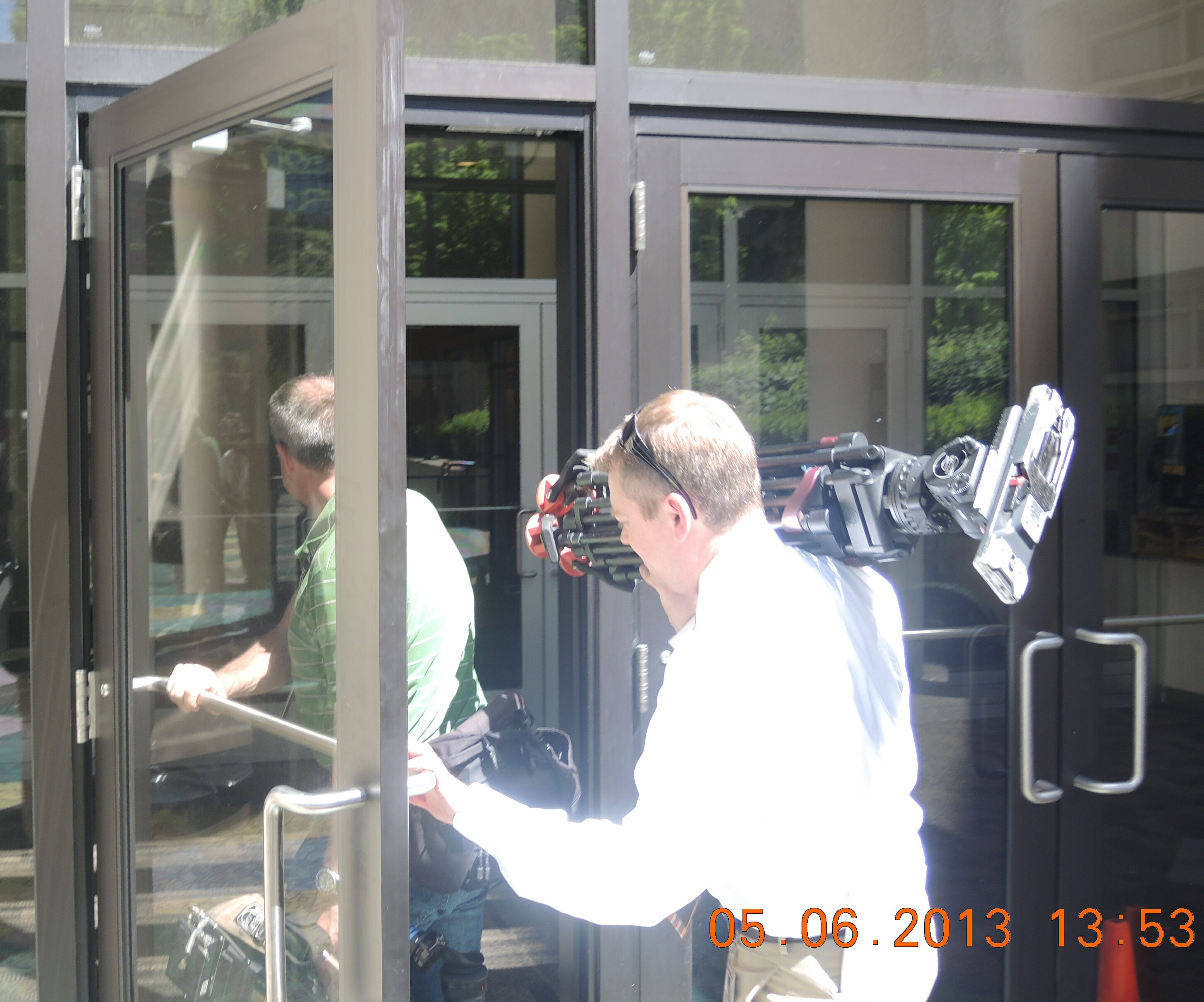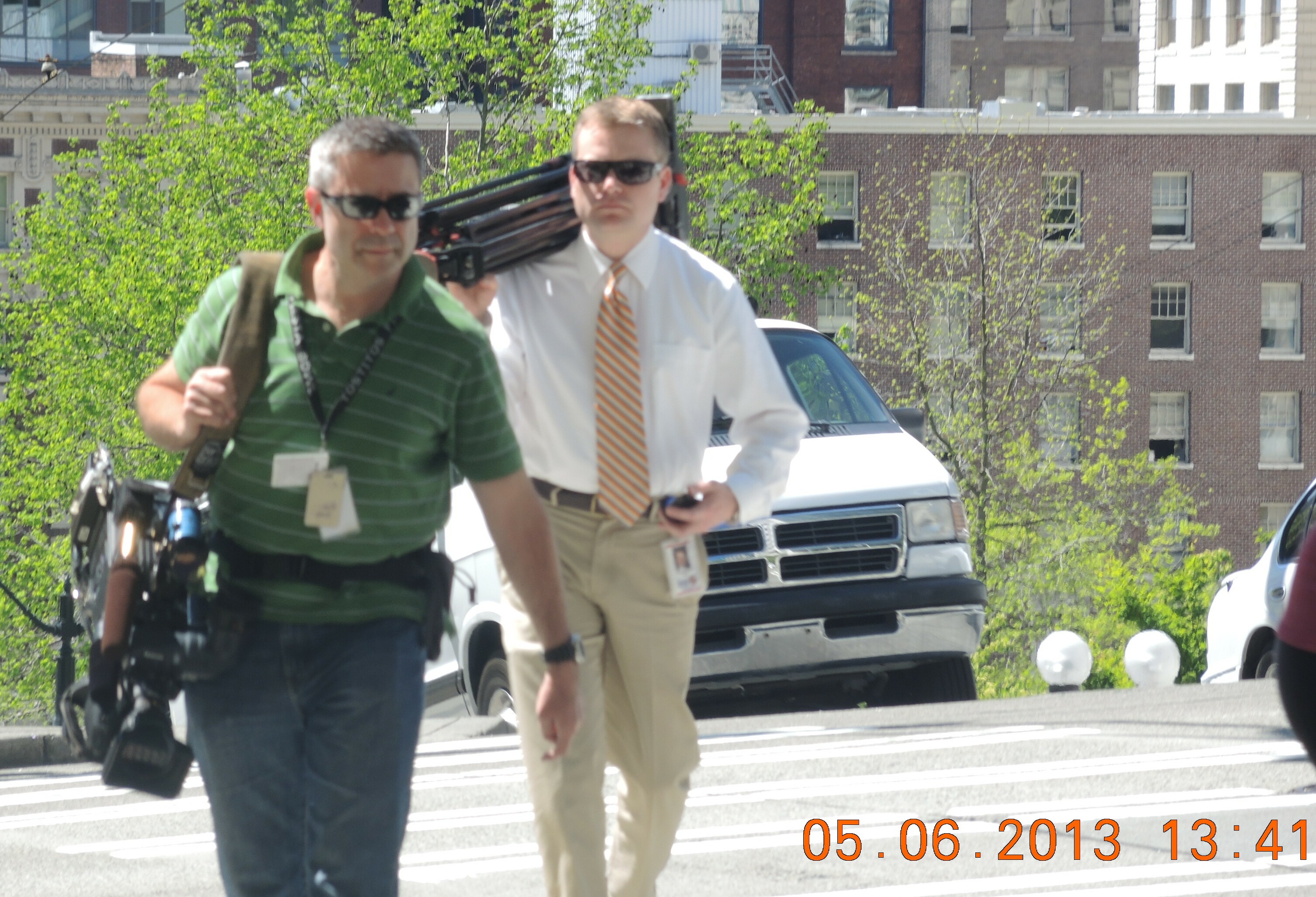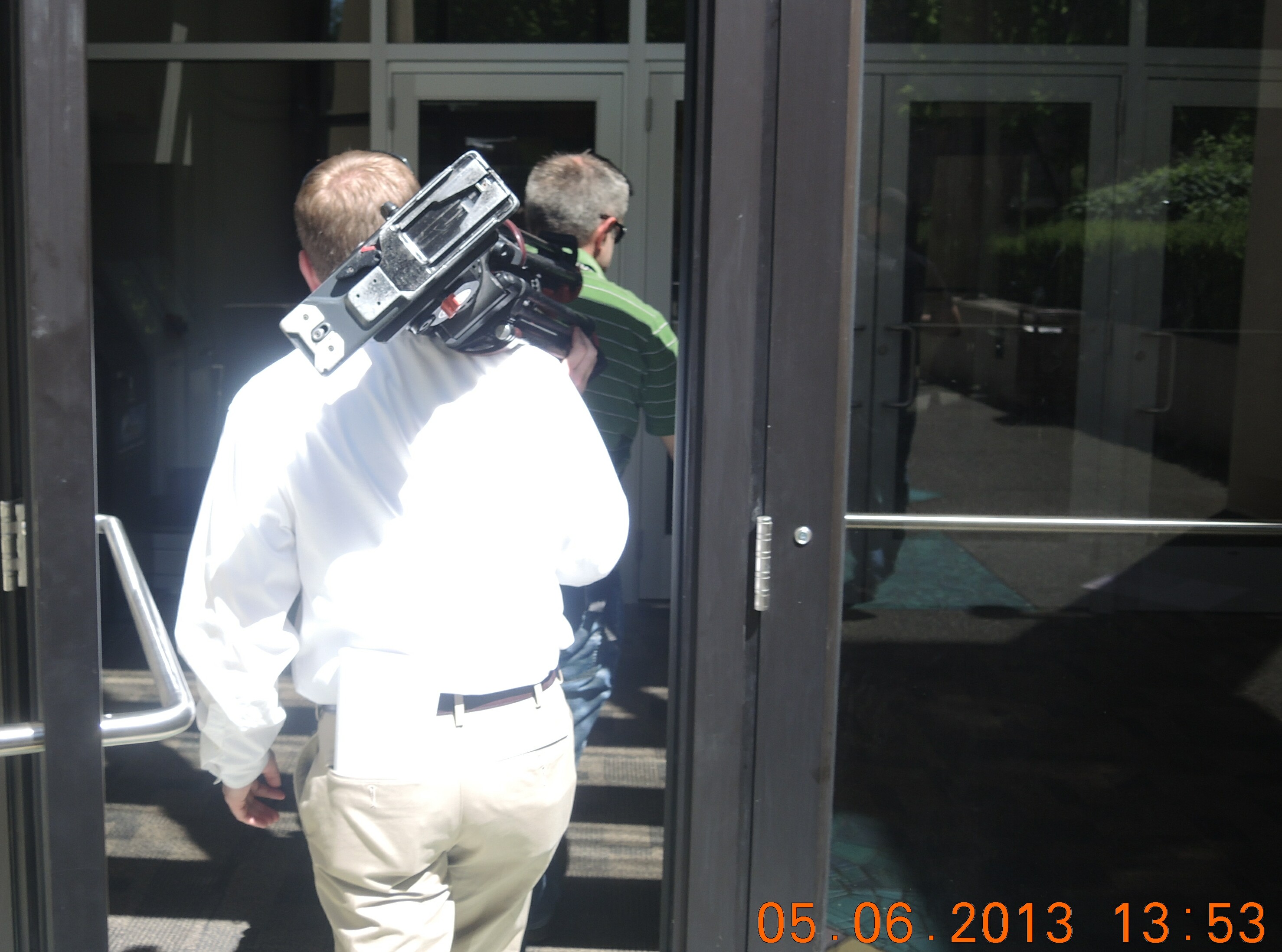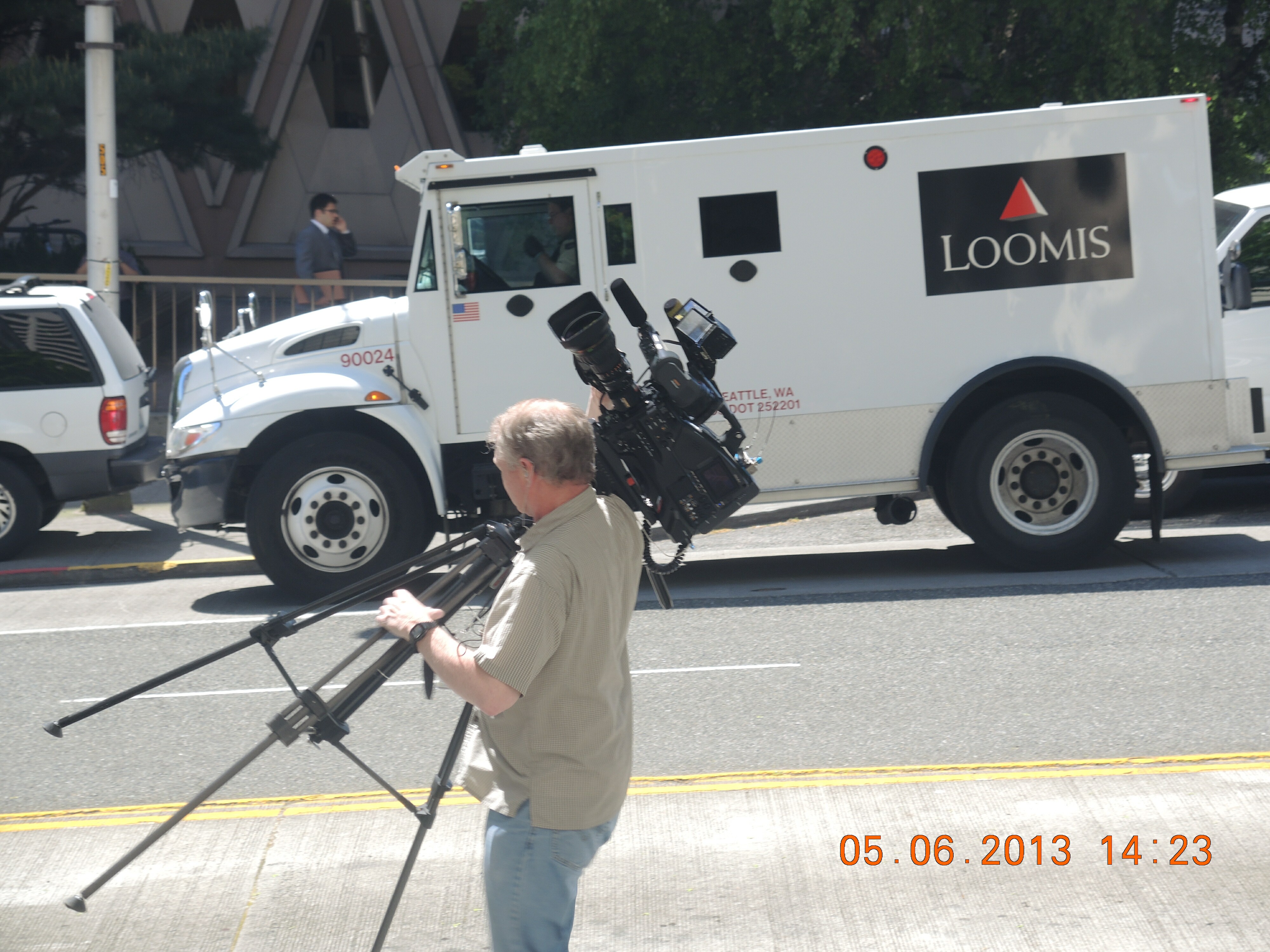 With plenty of time on their hands before the 2:30 pm courtroom proceedings began, the corporate newsmen began to interview the excluded photojournalist, each in turn as they arrived on site. The light was good, their rigs were massive, and they arrived in paired teams. At one point, the diesel engine of a nearby armored car collecting court/county loot proved disruptive.