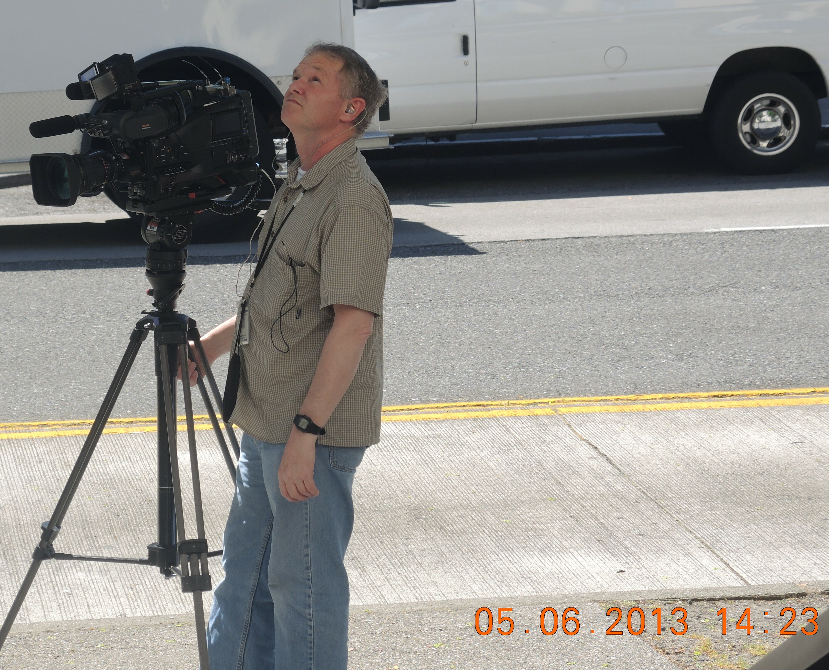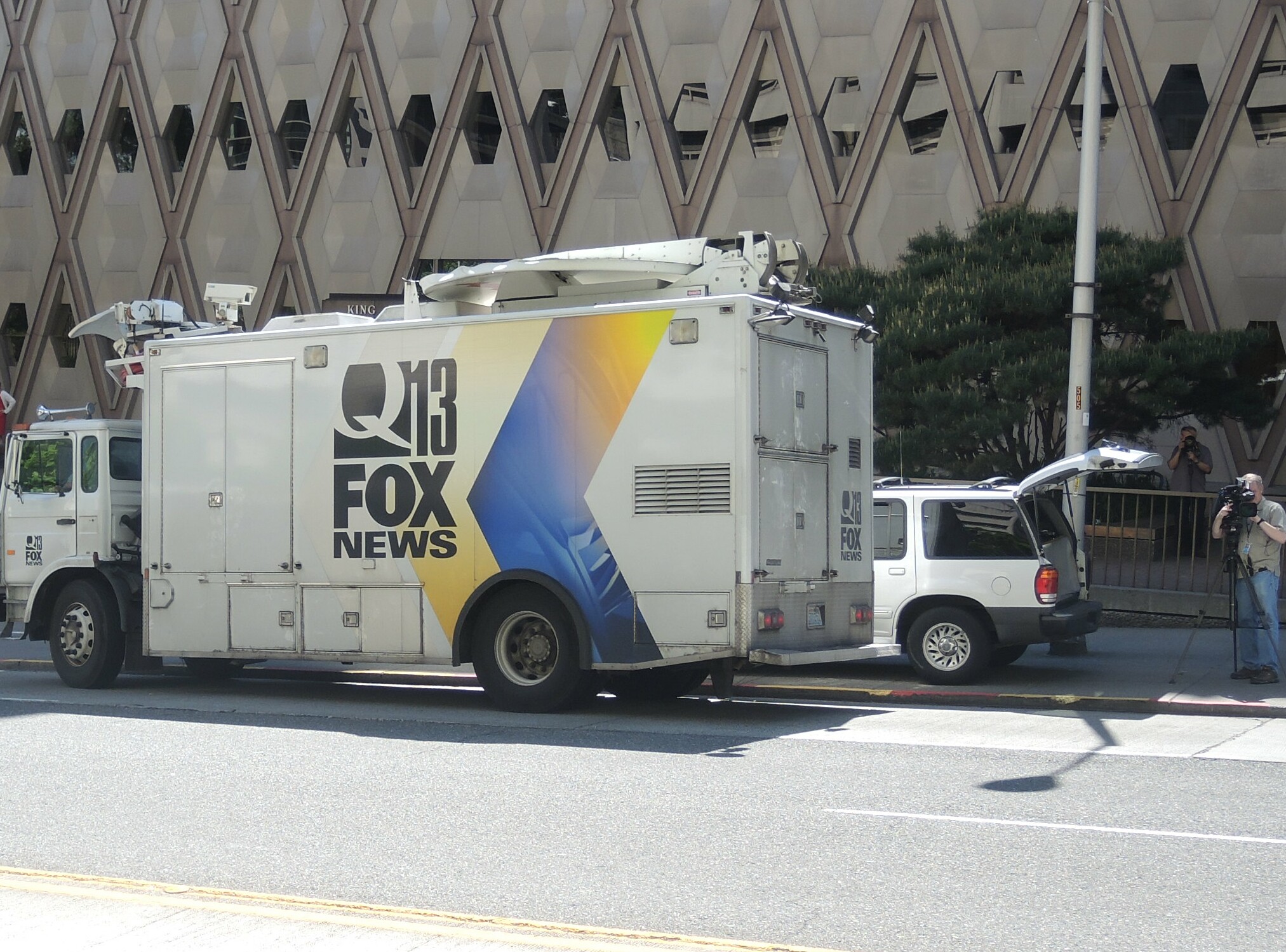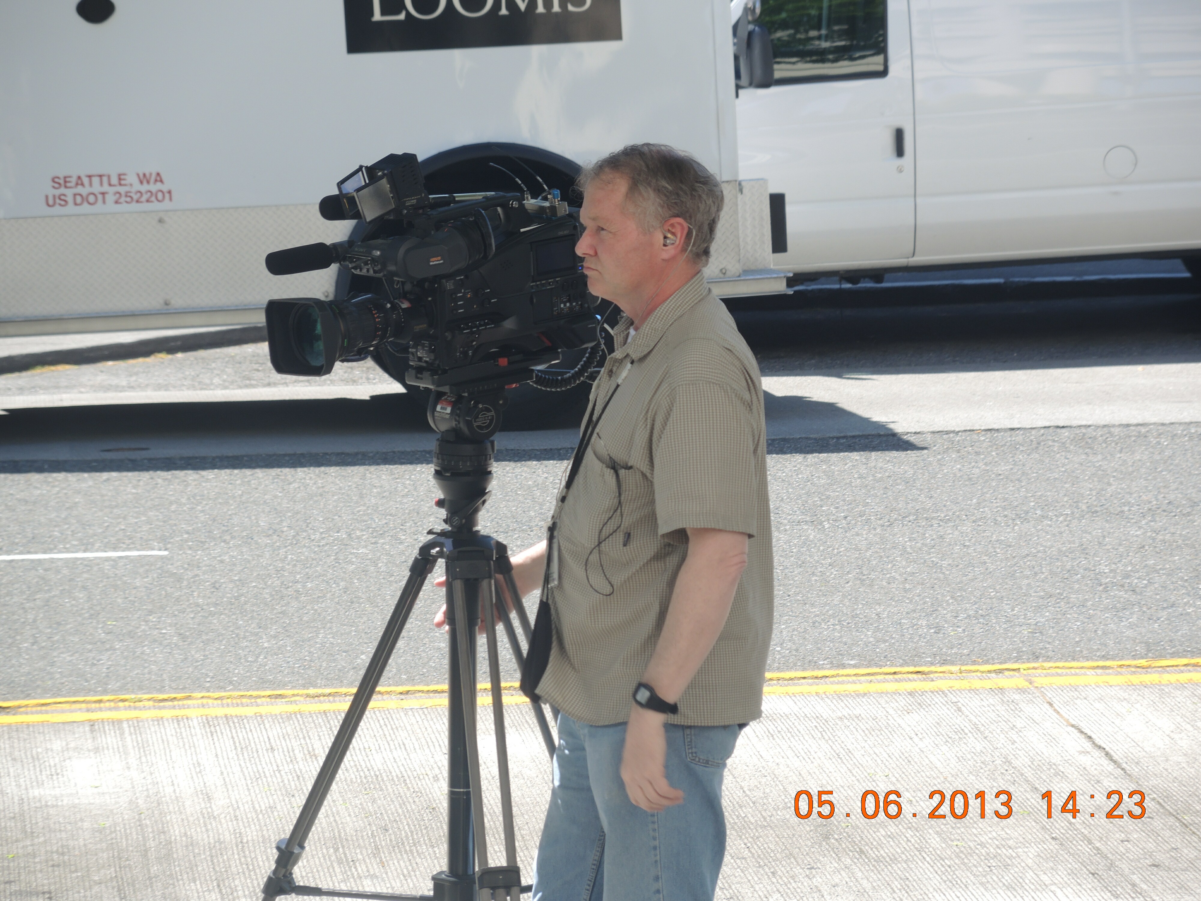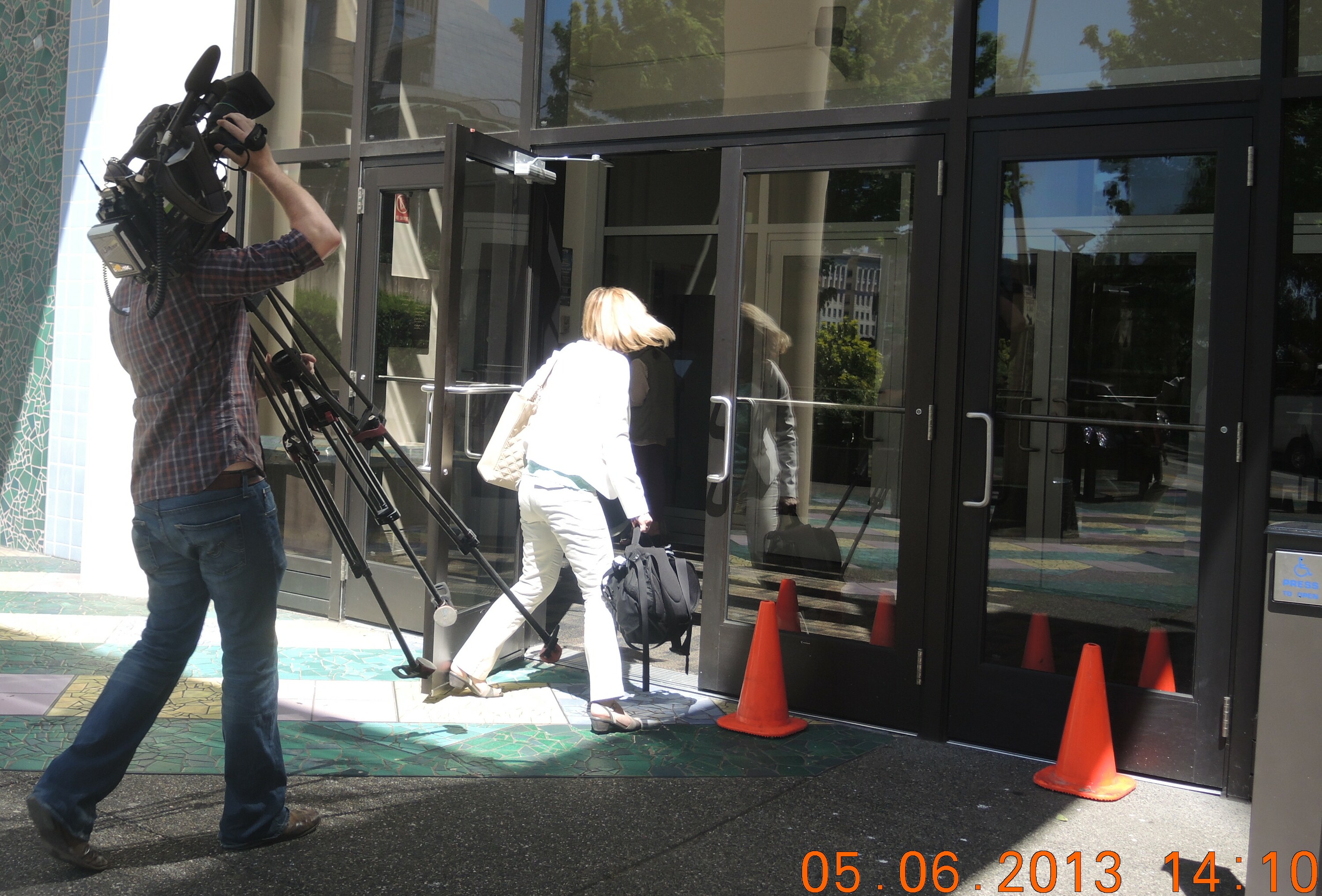 With plenty of time on their hands before the 2:30 pm courtroom proceedings began, the corporate newsmen began to interview the excluded photojournalist, each in turn as they arrived on site. The light was good, their rigs were massive, and they arrived in paired teams. At one point, the diesel engine of a nearby armored car collecting court/county loot proved disruptive.