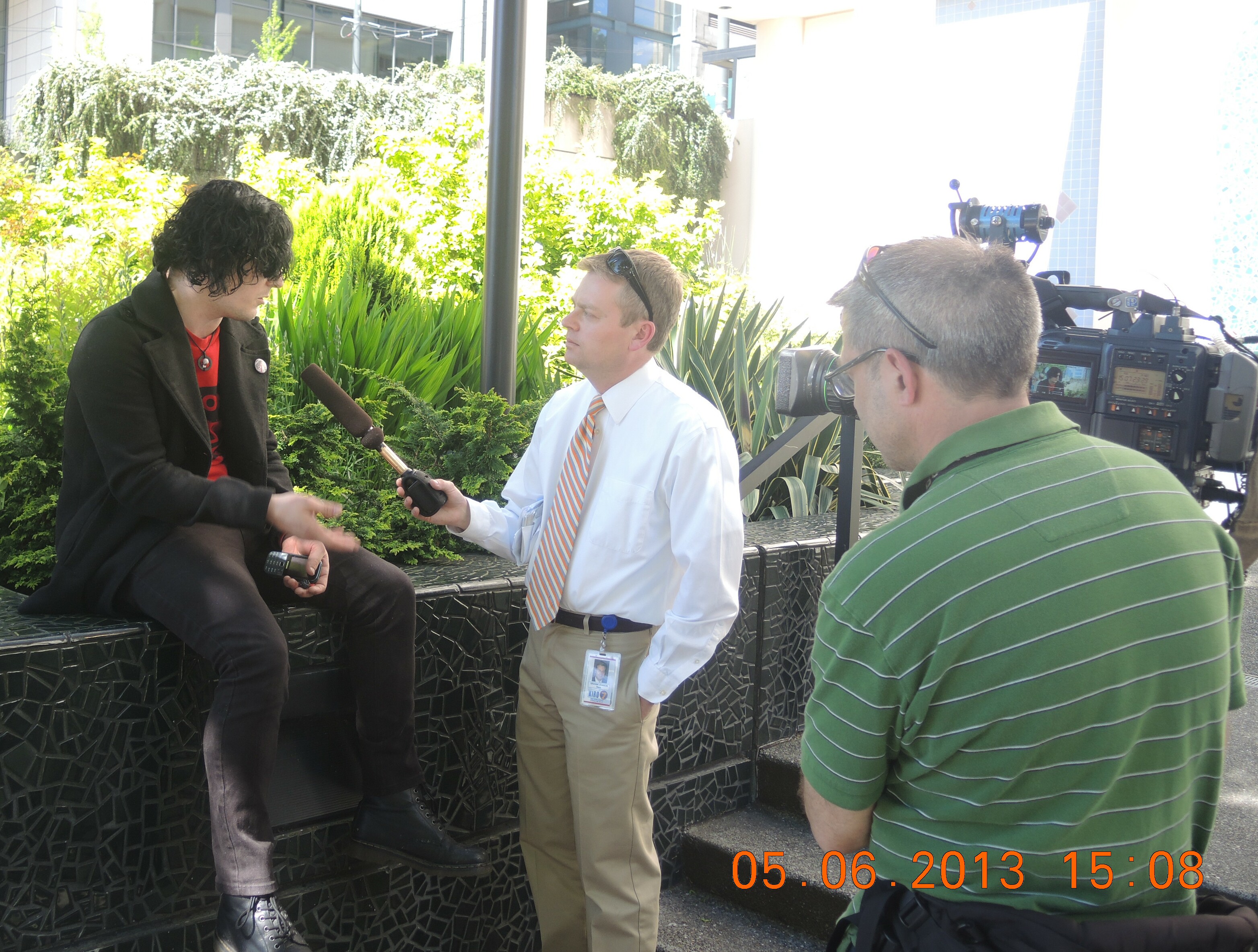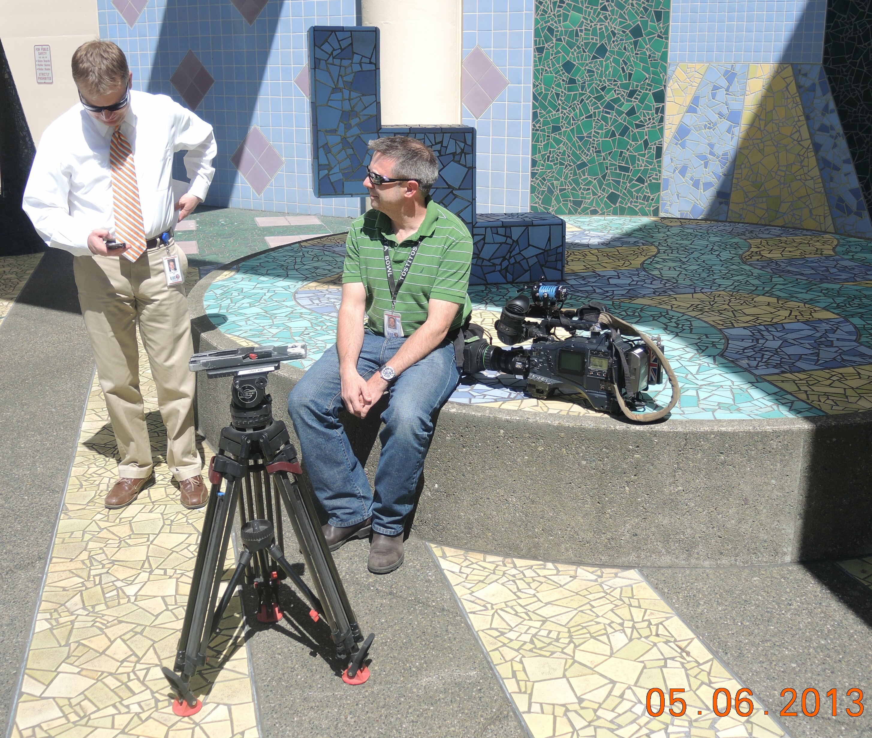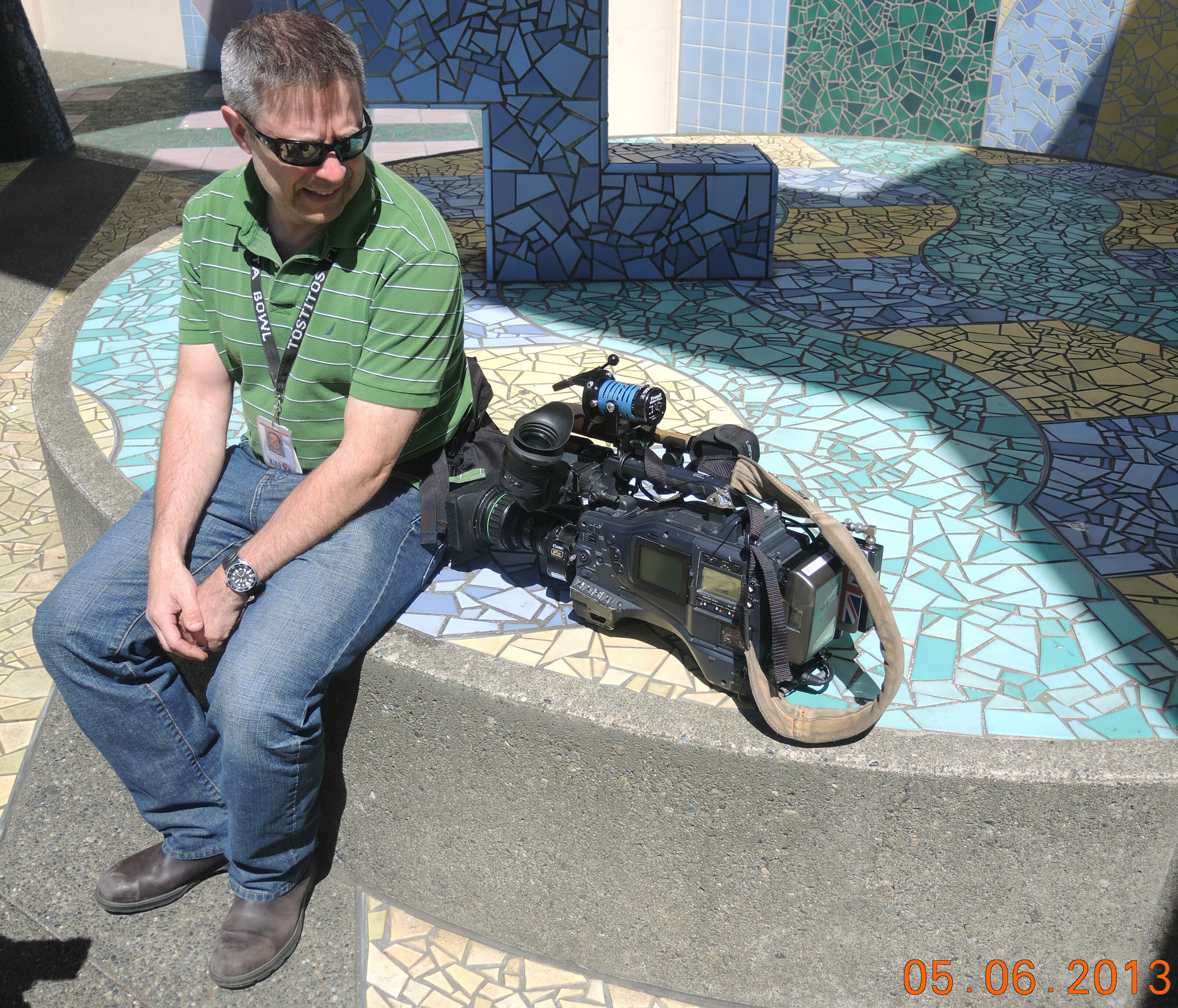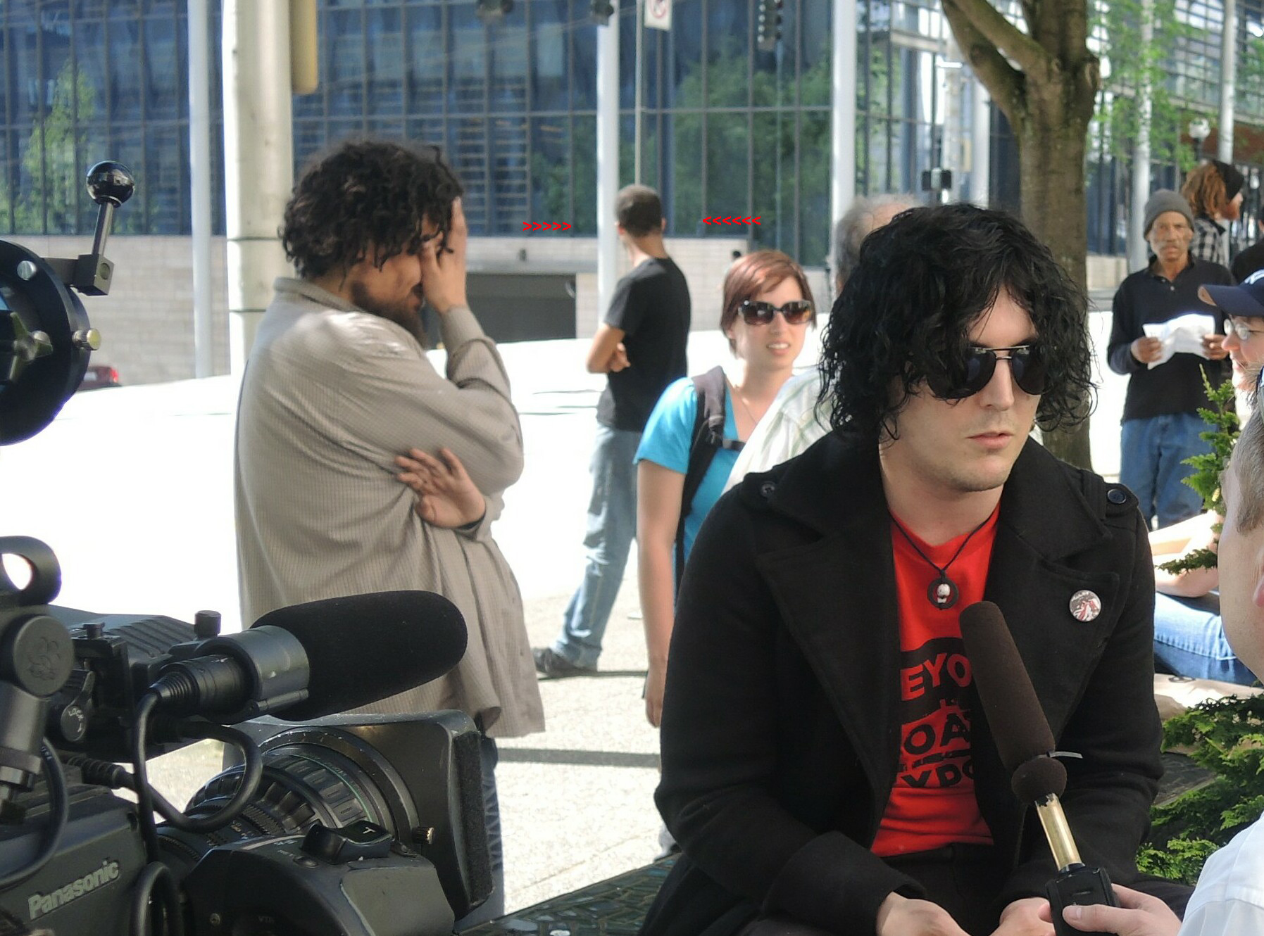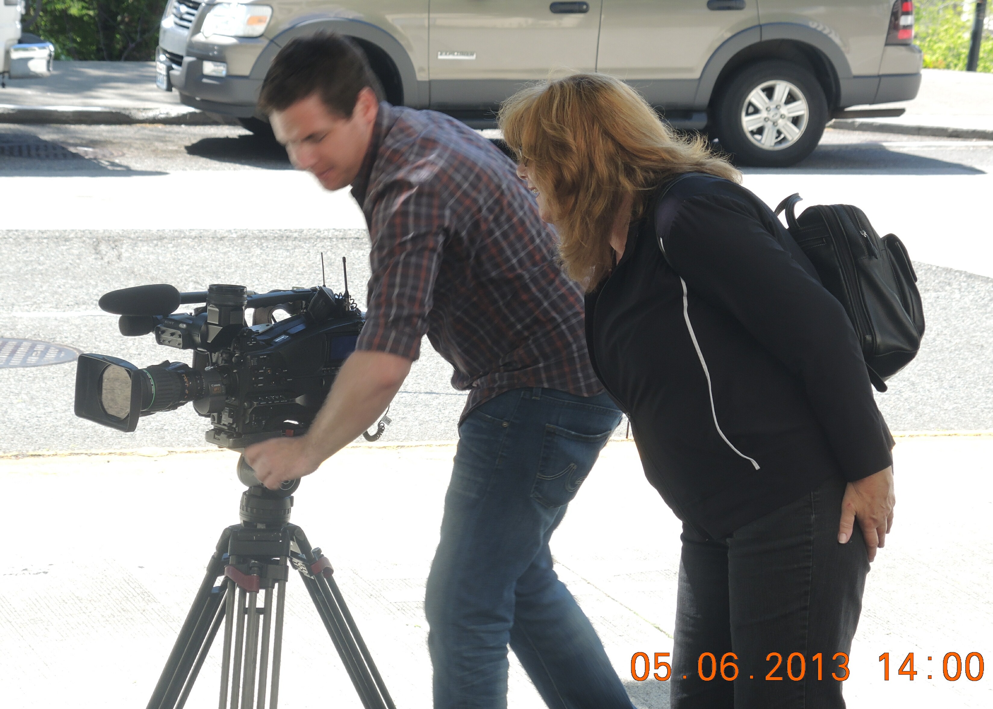With plenty of time on their hands before the 2:30 pm courtroom proceedings began, the corporate newsmen began to interview the excluded photojournalist, each in turn as they arrived on site. The light was good, their rigs were massive, and they arrived in paired teams. At one point, the diesel engine of a nearby armored car collecting court/county loot proved disruptive.