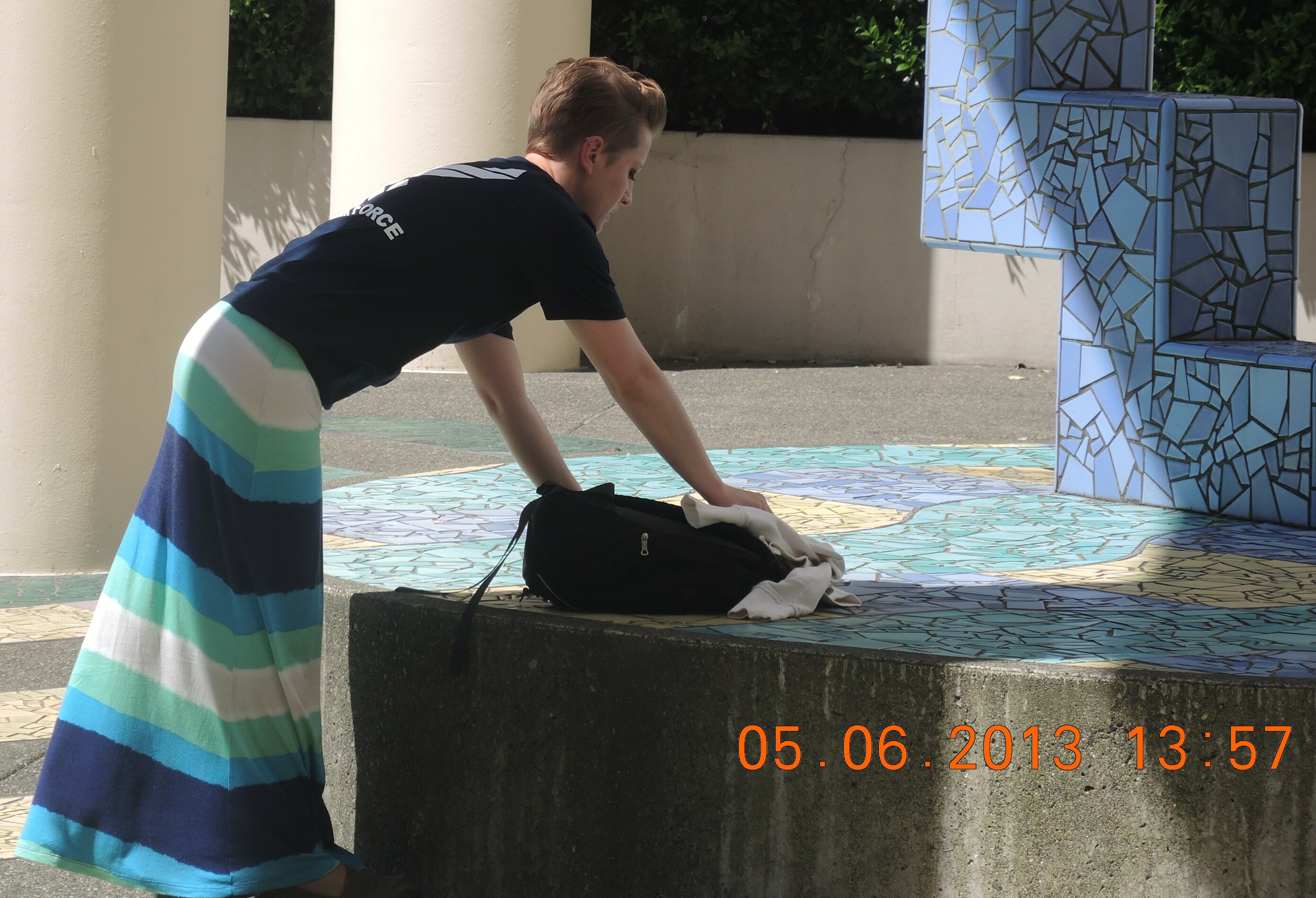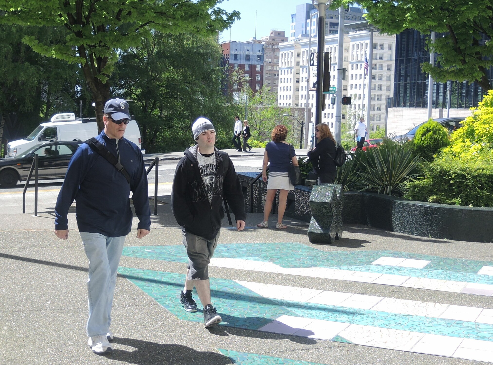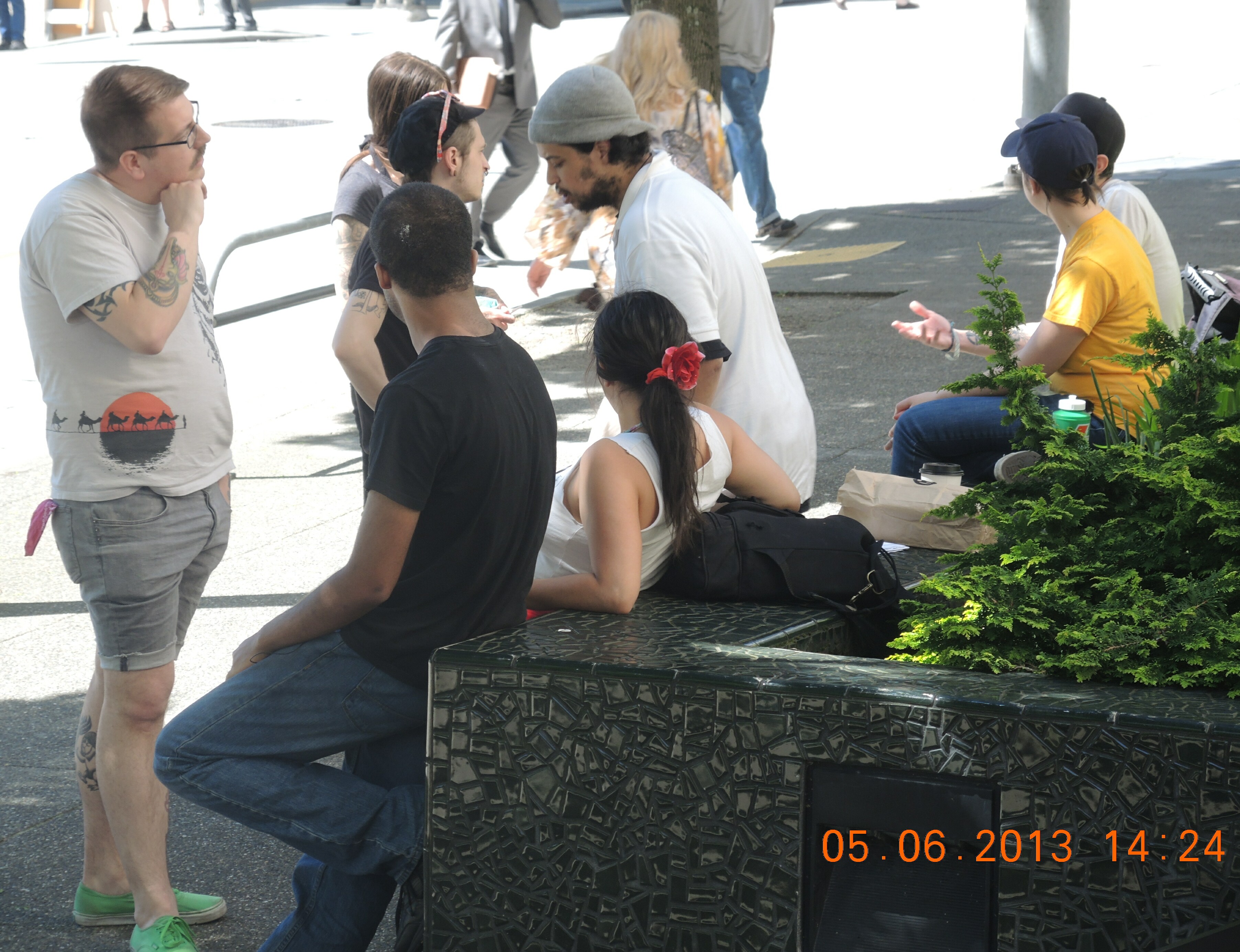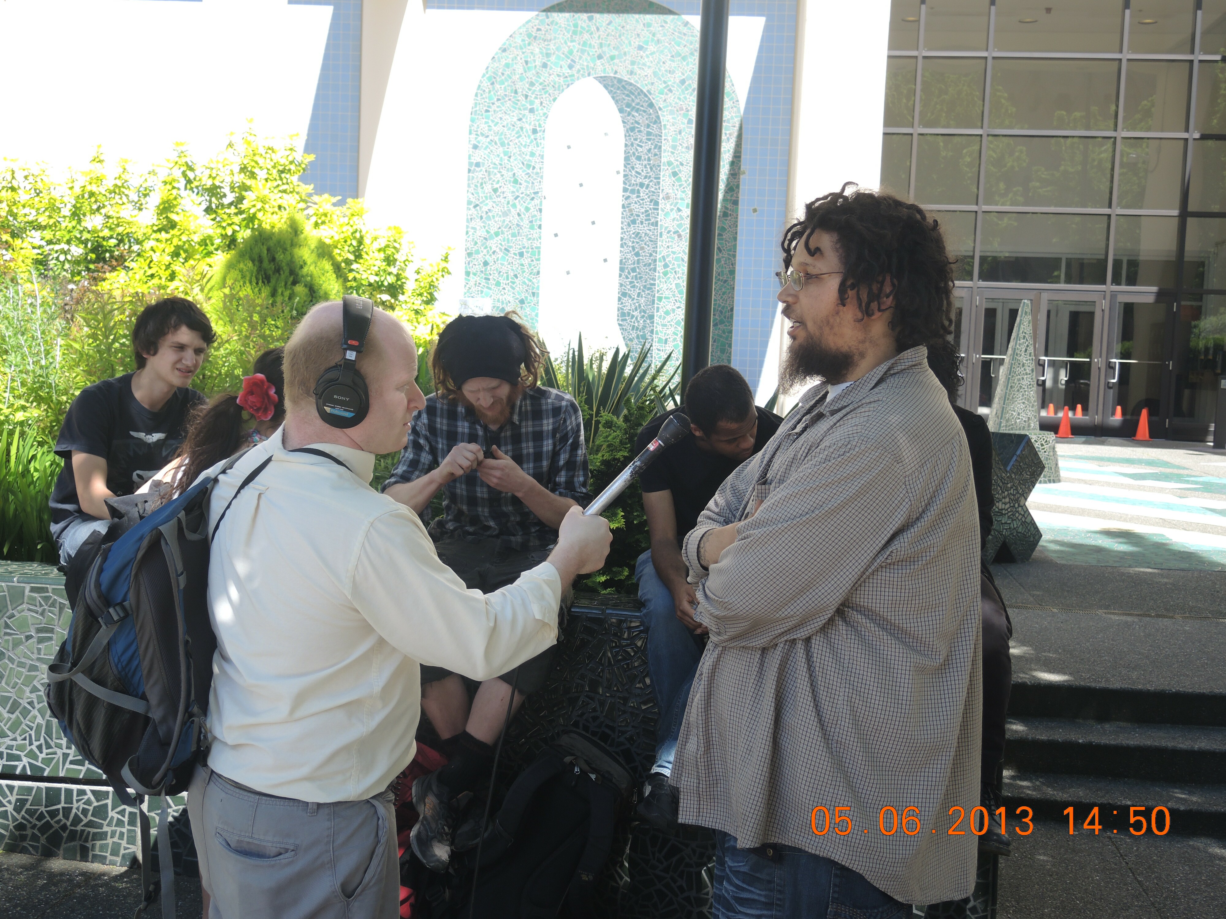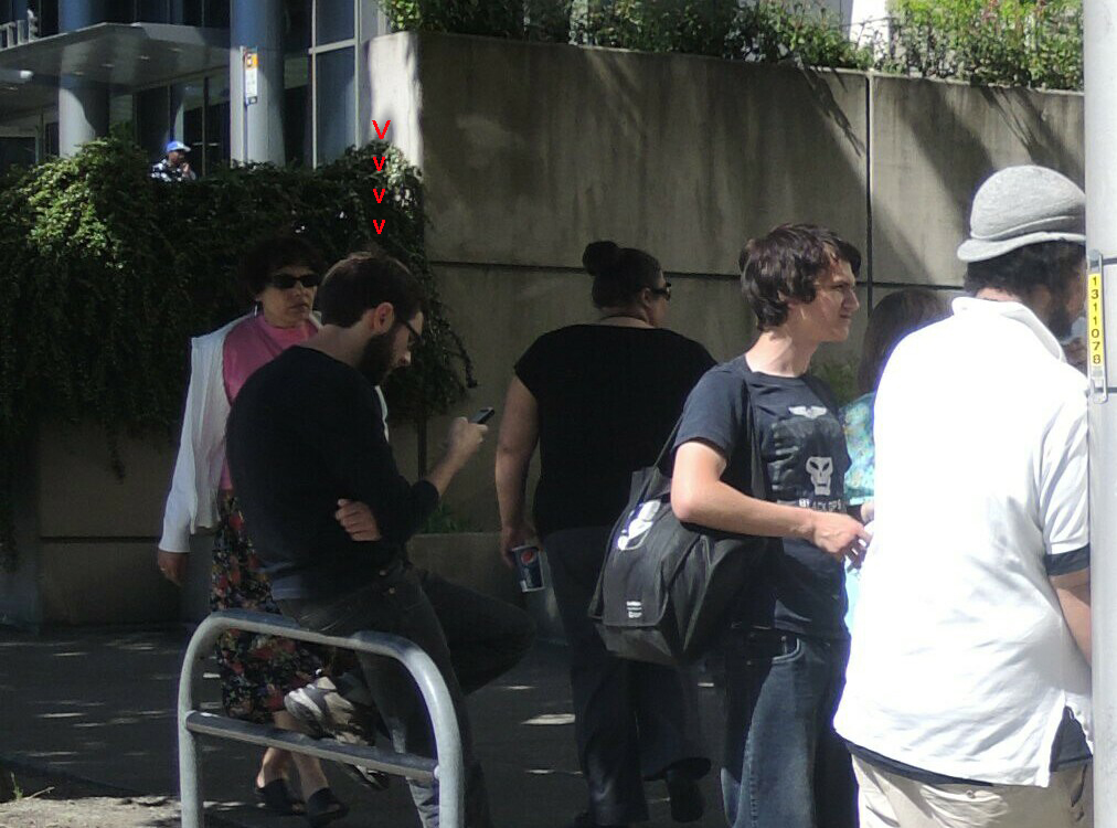 Pay particular attention to the last minute, or so of the clip as the guy who has been particularly camera shy this afternoon in the jailhouse courtyard at 5th & James stalks, circles behind the photojournalist, then casually saunters off as he realizes he has been noticed. Notice the reaction of his comrades at this moment. Like a shark bumping its quarry to determine if it is prey. The behavior was reminiscent of what happened during the assault-robbery of a photojournalist at the Evergreen State College (TESC) campus on 4-20-13 @ ~11:30pm in the Seminar II, Bldg ‘C’, 3rd floor location. See http://amicuscuria.com/wordpress/?p=9505 for details