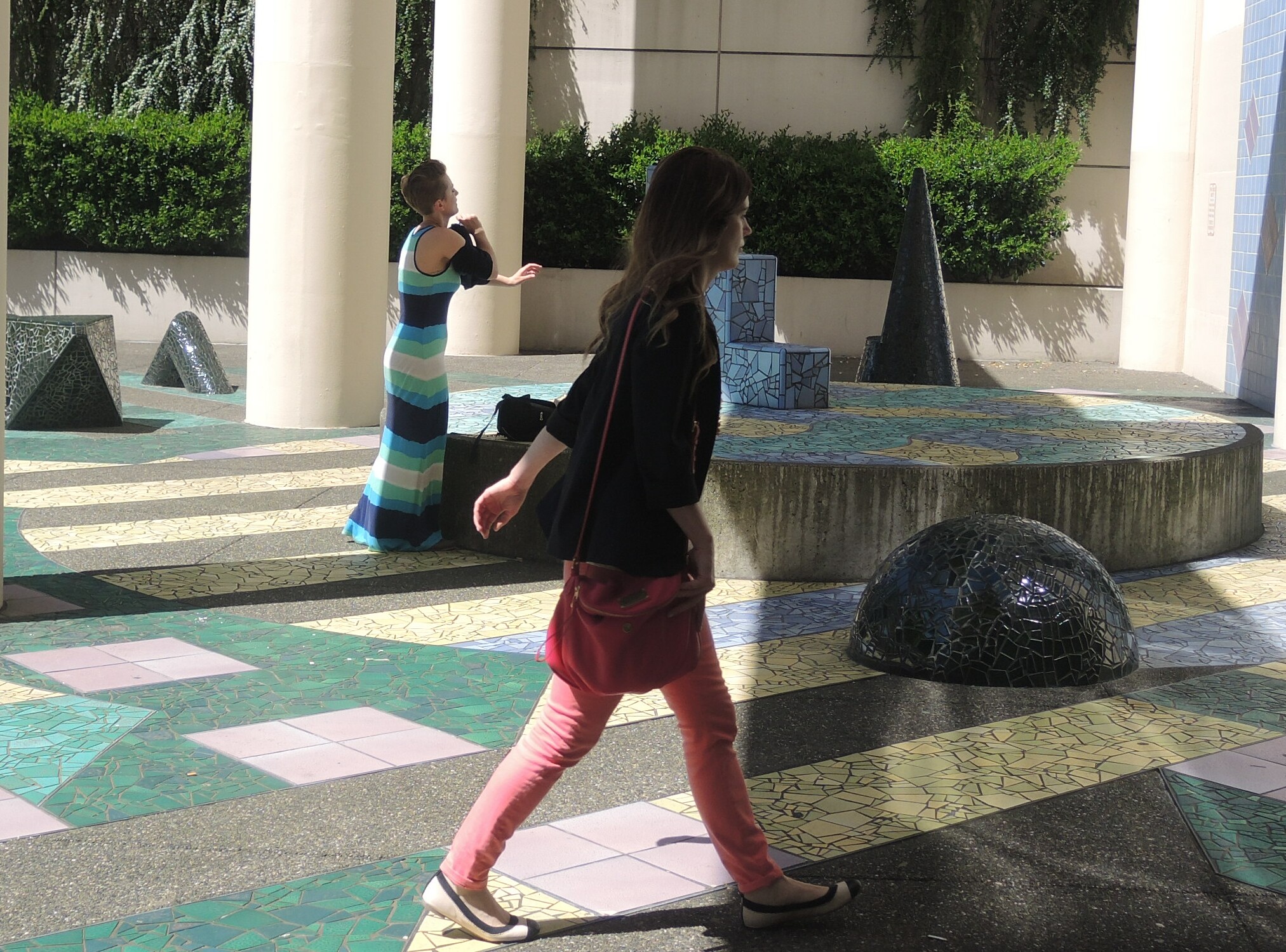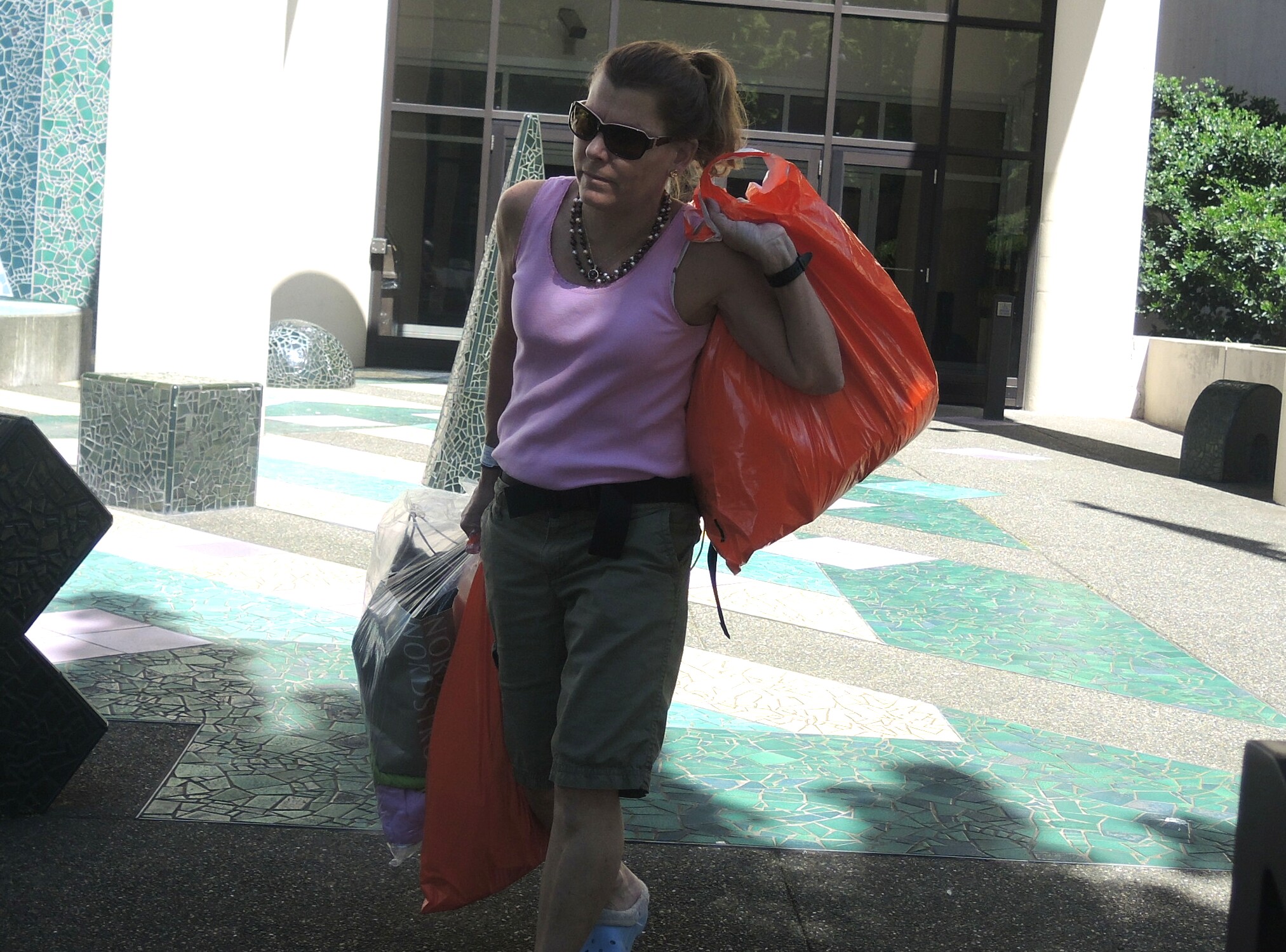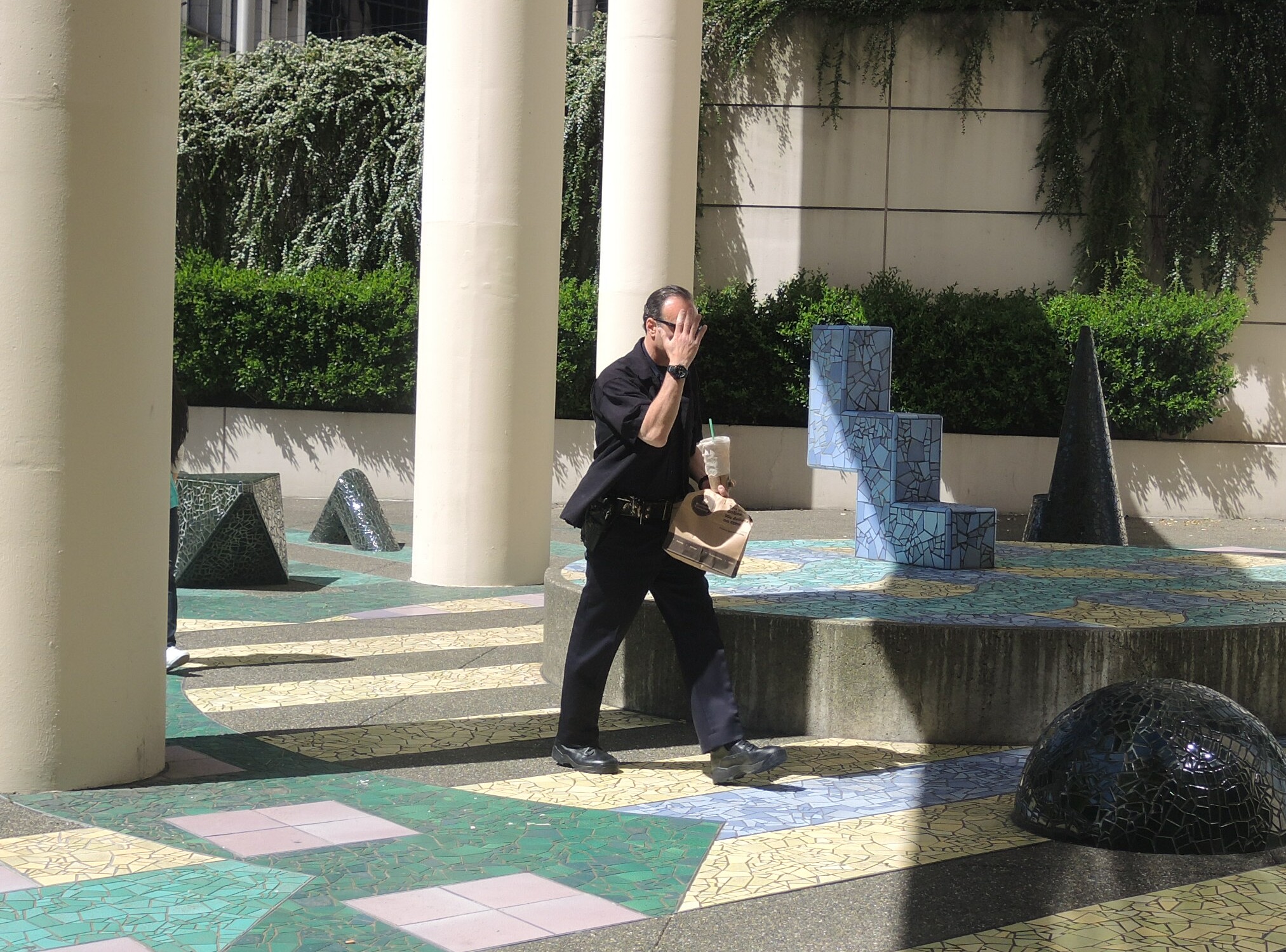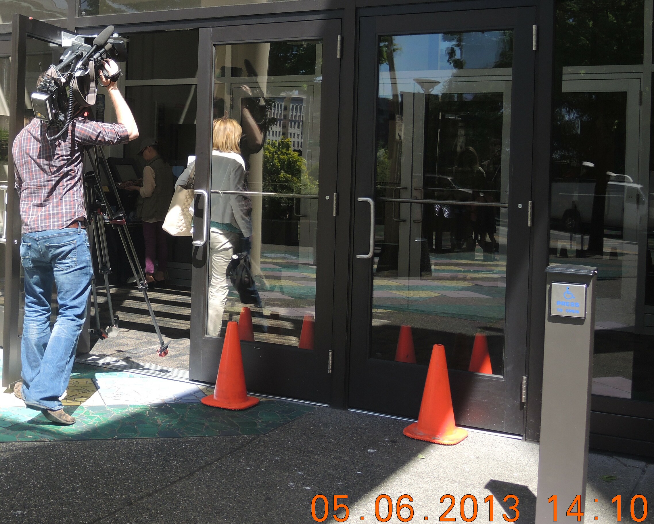 Opting to photograph who showed up in the jailhouse plaza in support of the accused, the weather proved to be warm, cloudless, and inviting. Springs are like that. It started out slow but picked up as 2:30 pm drew nearer. The jailhouse guards assured the excluded photojournalist NO hearing was scheduled this day for any of those accused of Seattle May Day transgressions. But as time wore on, KOMO arrived, then KIRO, KING 5, and the Seattle Times, et ux. Each, in turn, entered the jailhouse and proceeded on to the courtroom, camera gear in tow, with barely a ripple.