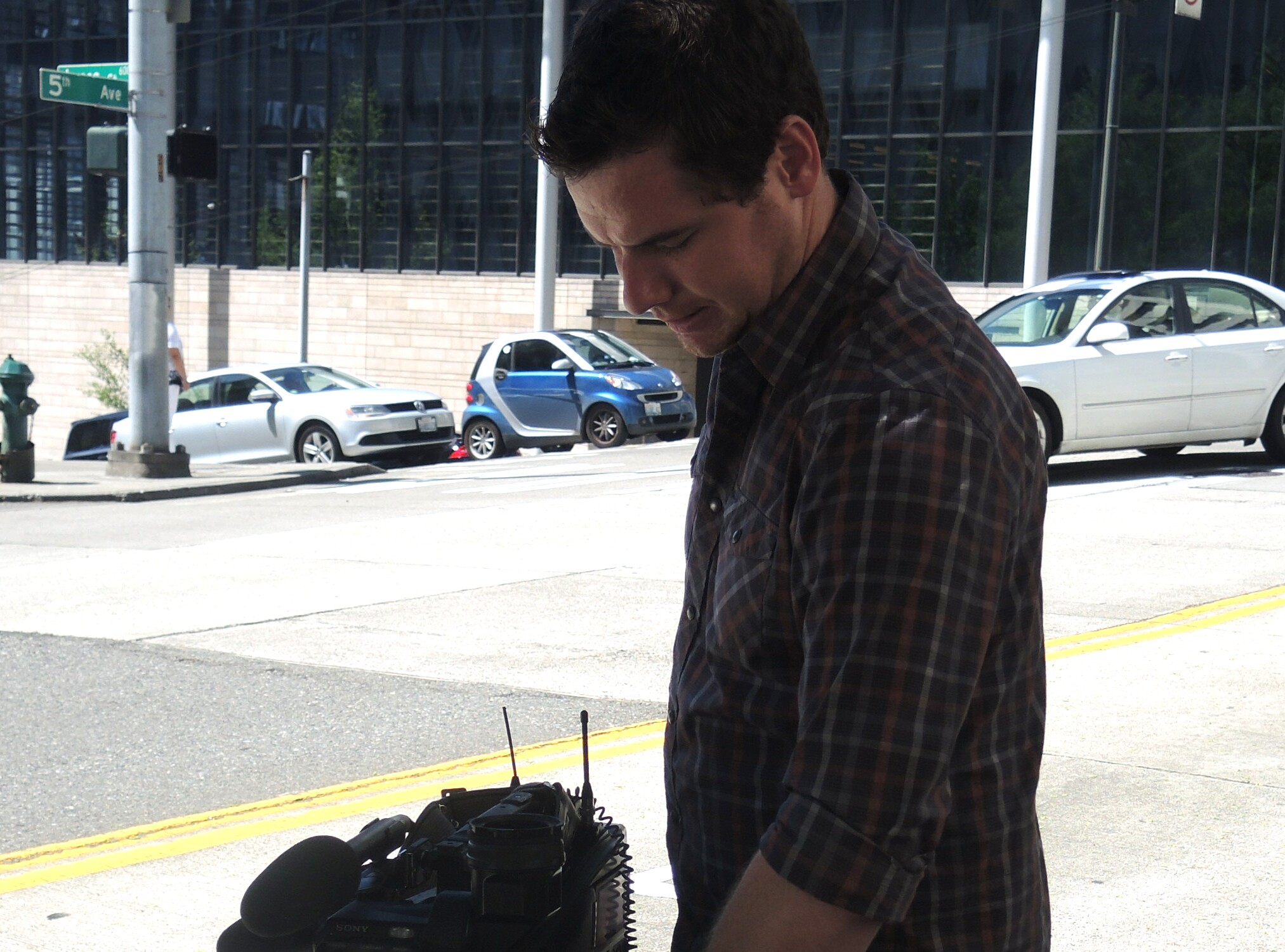 Mark Taylor-Canfield of Seattle’s Sac Lunches is interviewed by media.