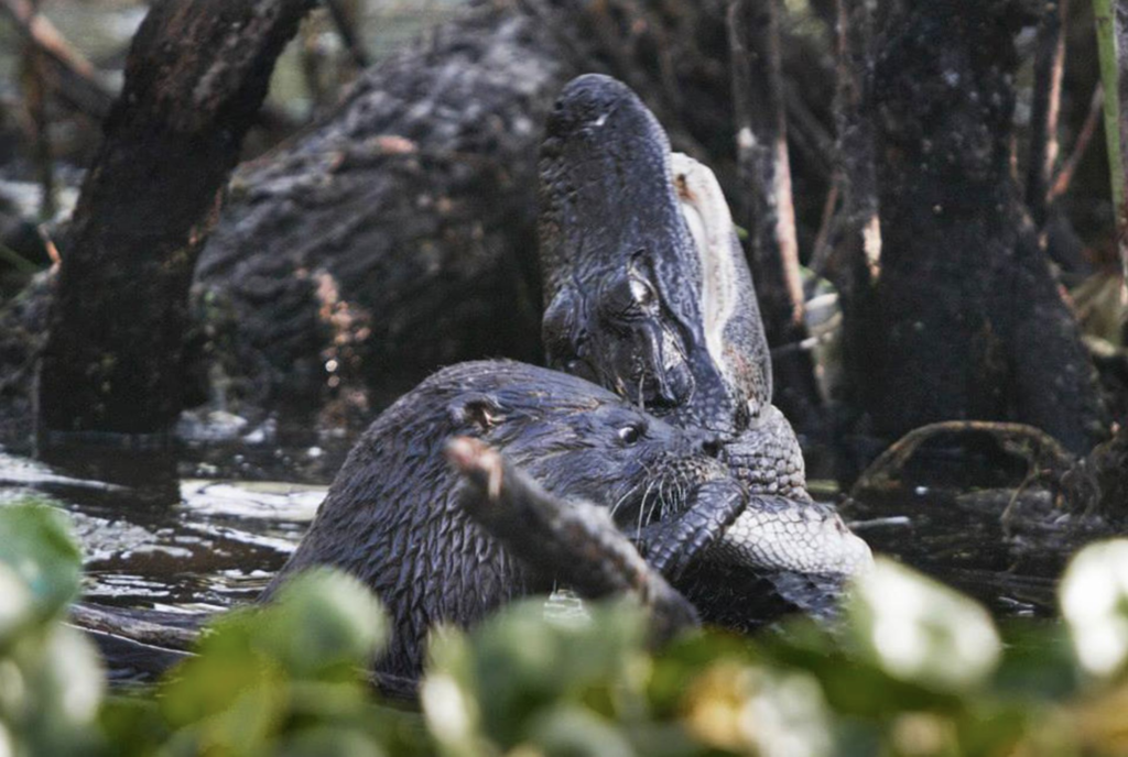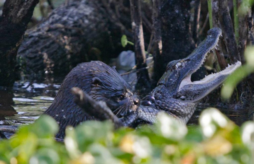 Otters are voracious predators, close to being apex [top predator] in most places where they live. So anywhere they overlap with gators this would be a pretty common occurrence. Still, this is impressive: That’s not a small alligator, probably three or four years old and five feet [1.5 meters] long. If that’s a male otter it might be 30 pounds. That’s a very bold animal!