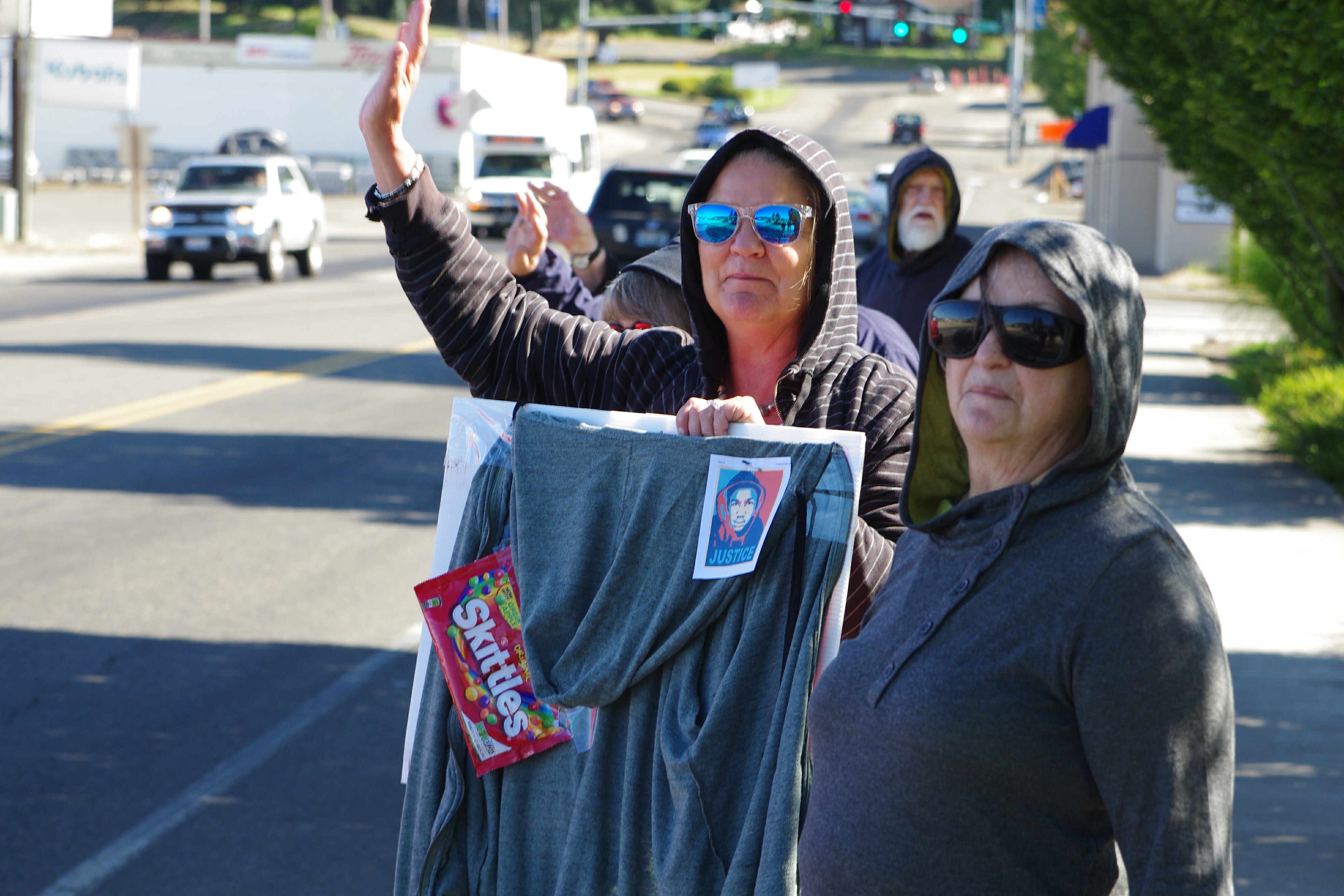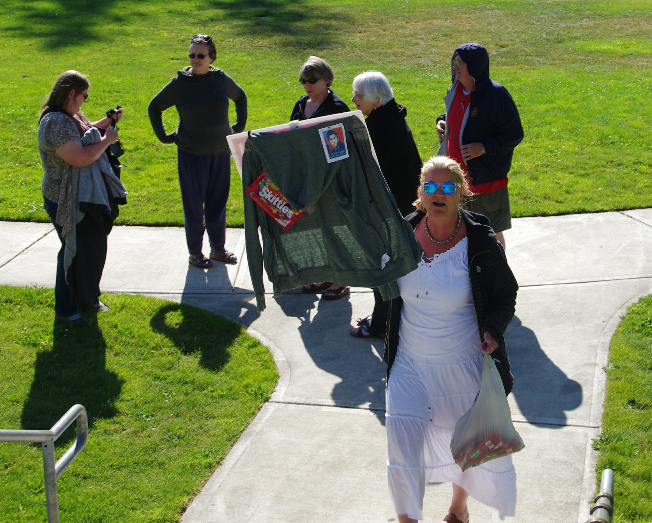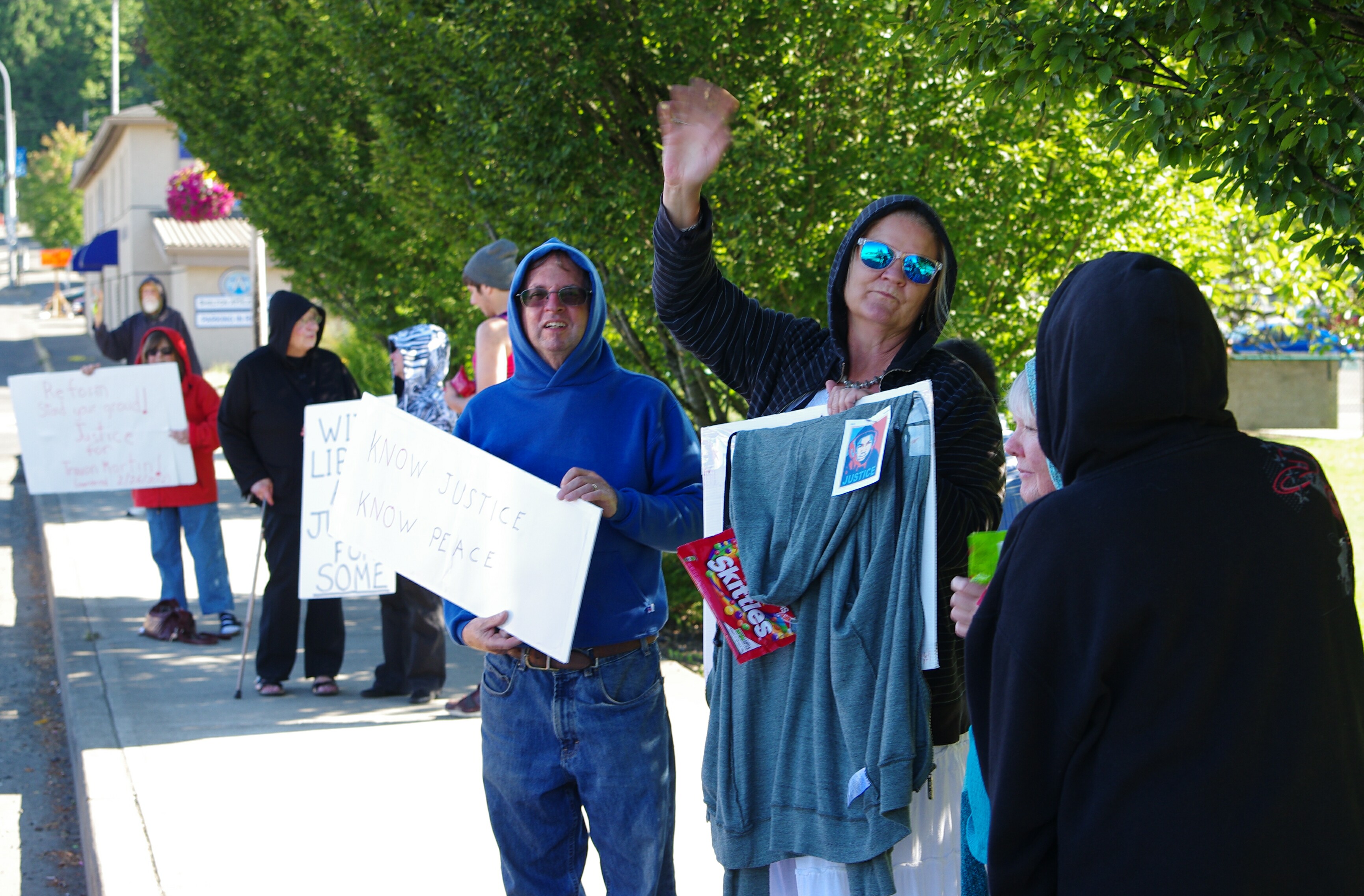 Shawnie Ann Vedder/Whelan (aka: Shawna Whelan) (dob: 10-9-65) of 1017 W. Franklin St, Shelton, WA. 98584 posted notice of the event, rode her bicycle along w/her youngest daughter to attend, but changed her mind after seeing this reporter w/camera in hand. Community activist Katherine Price showed up, as did her friend, Sheri Staley. Several others (including Pat Vanderhay) donned hoodies to amplify their voices while some displayed packets of Skittles or held signs protesting what they viewed as a miscarriage of justice that allowed Zimmerman to walk away as a free man after a jury returned a not-guilty verdict in his murder trial. Nevertheless, the local activists who displayed their displeasure with the verdict, the SYG laws around the country, and the right of citizens with a permit to carry a concealed handgun, insisted on referring to Zimmerman as a ‘murderer’.