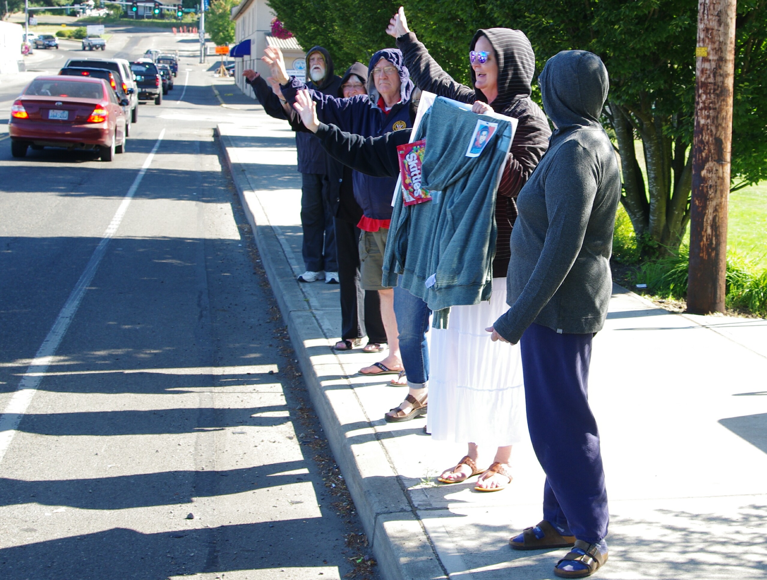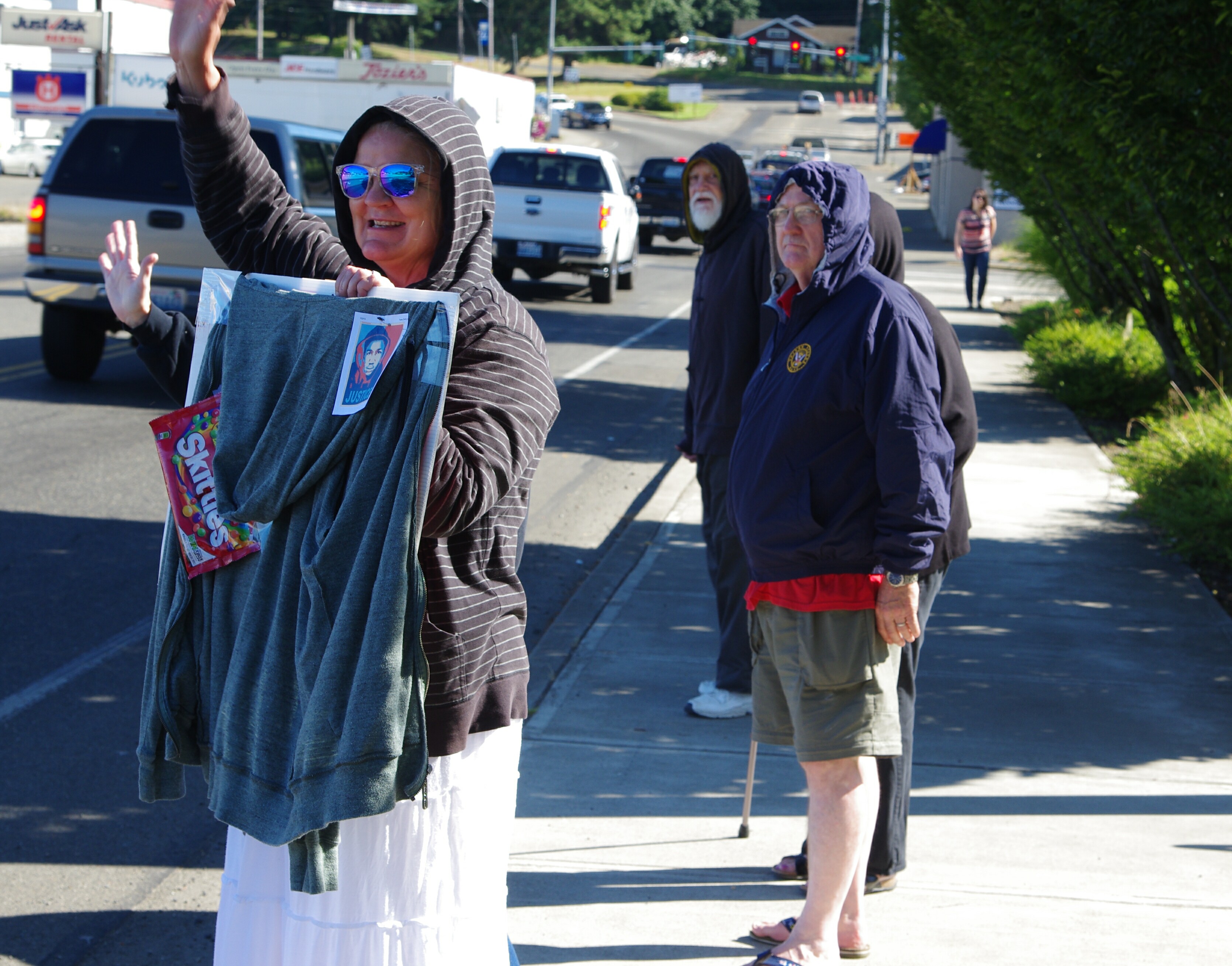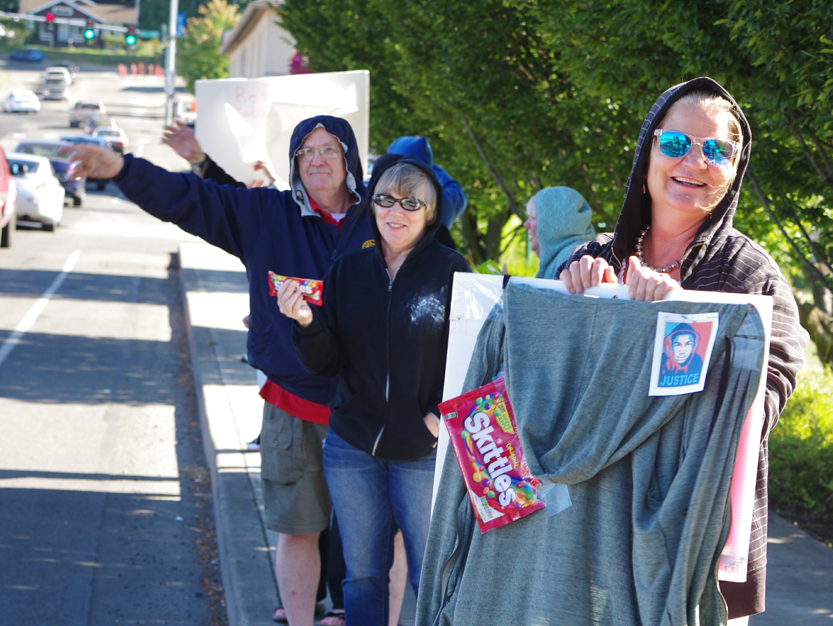 Shawnie Ann Vedder/Whelan (aka: Shawna Whelan) (dob: 10-9-65) of 1017 W. Franklin St, Shelton, WA. 98584 posted notice of the event, rode her bicycle along w/her youngest daughter to attend, but changed her mind after seeing this reporter w/camera in hand. Community activist Katherine Price showed up, as did her friend, Sheri Staley. Several others (including Pat Vanderhay) donned hoodies to amplify their voices while some displayed packets of Skittles or held signs protesting what they viewed as a miscarriage of justice that allowed Zimmerman to walk away as a free man after a jury returned a not-guilty verdict in his murder trial. Nevertheless, the local activists who displayed their displeasure with the verdict, the SYG laws around the country, and the right of citizens with a permit to carry a concealed handgun, insisted on referring to Zimmerman as a ‘murderer’.