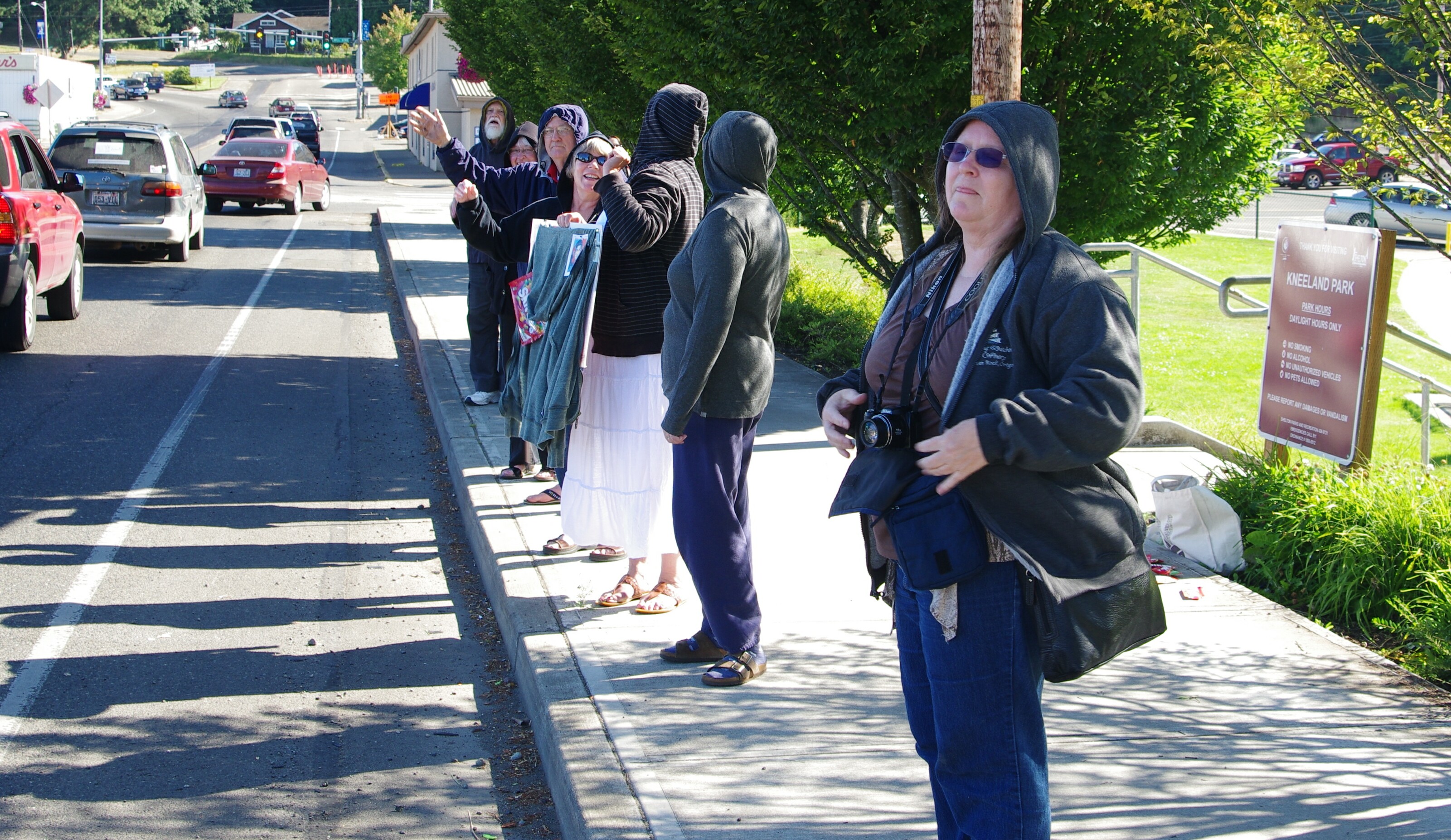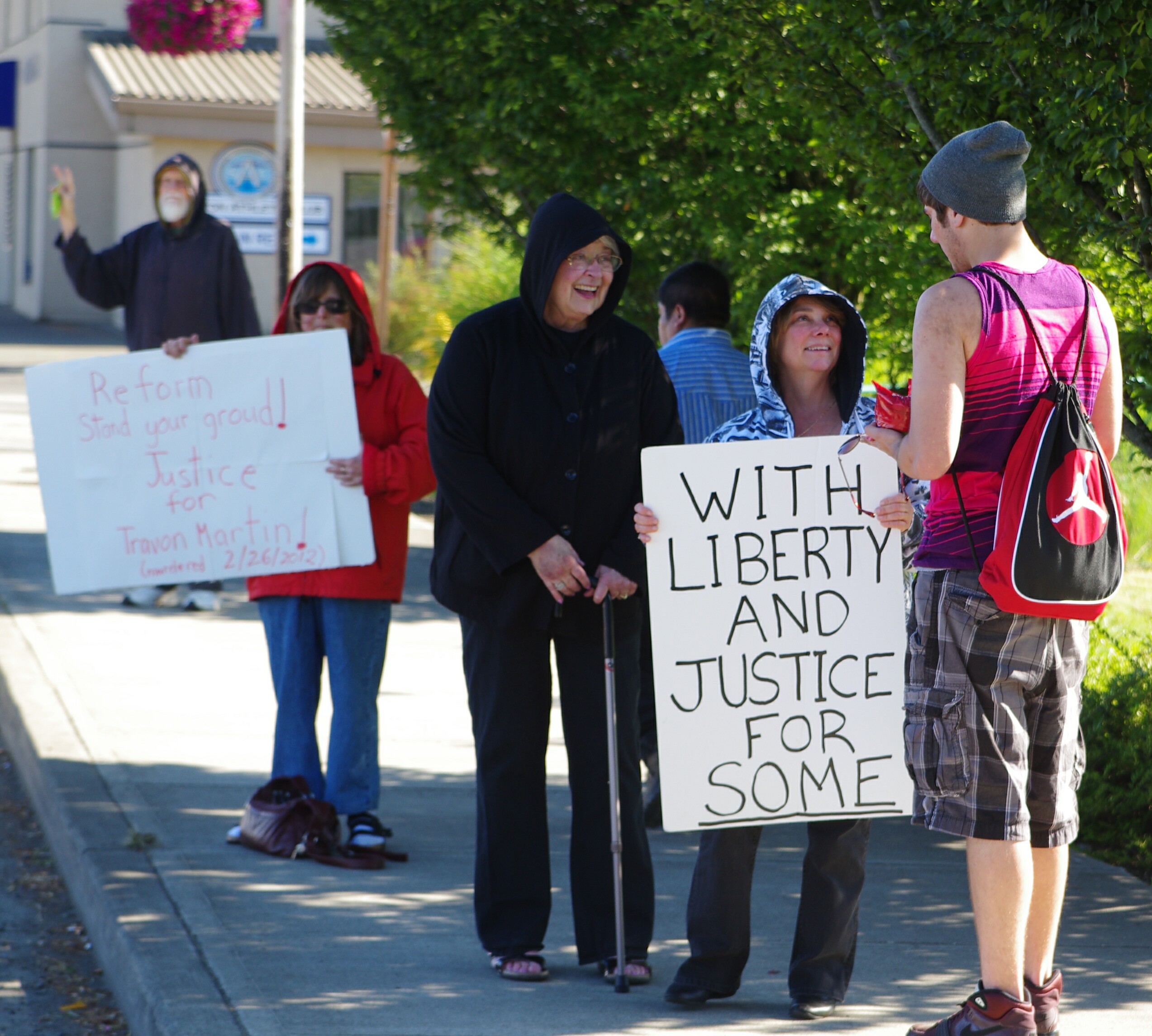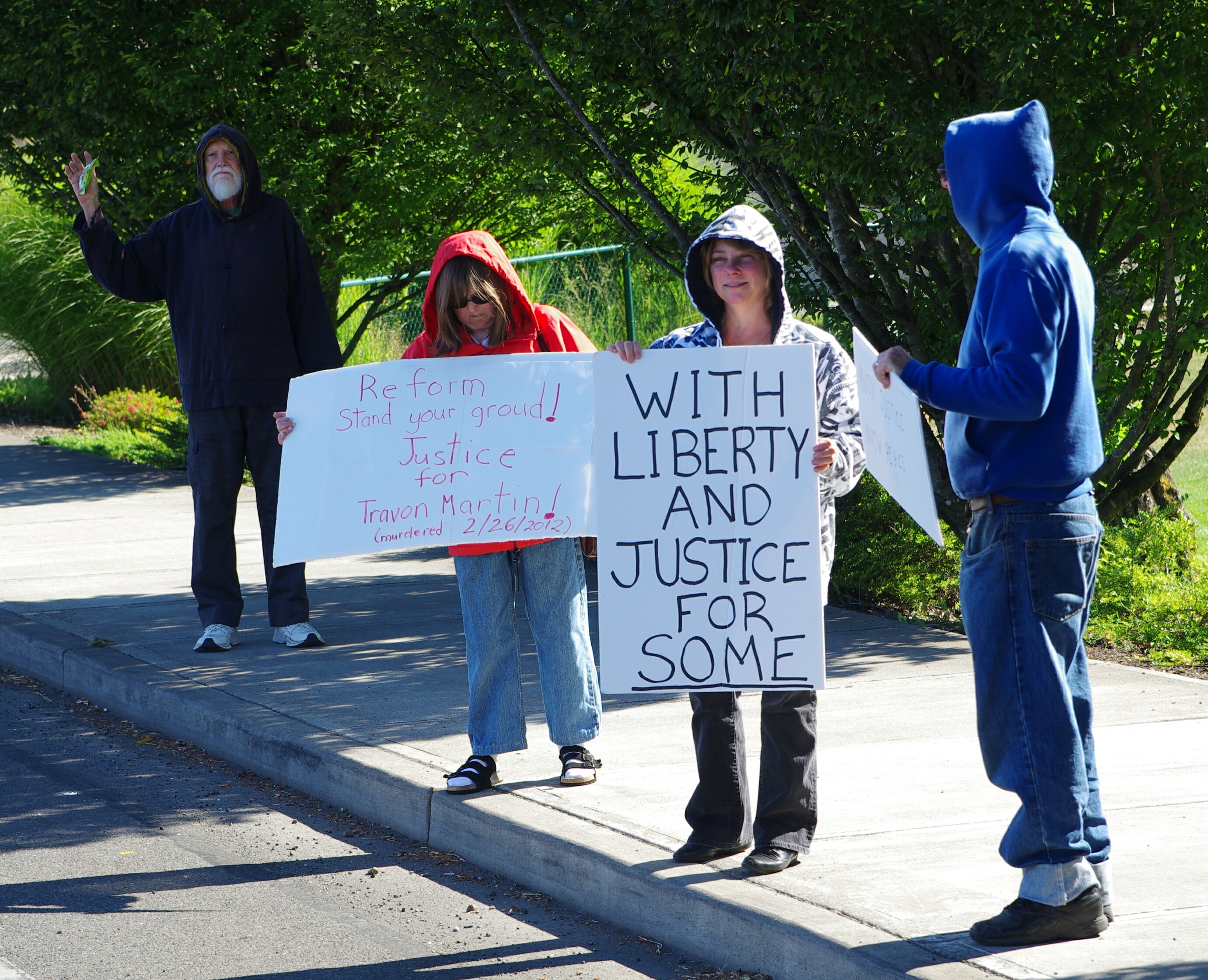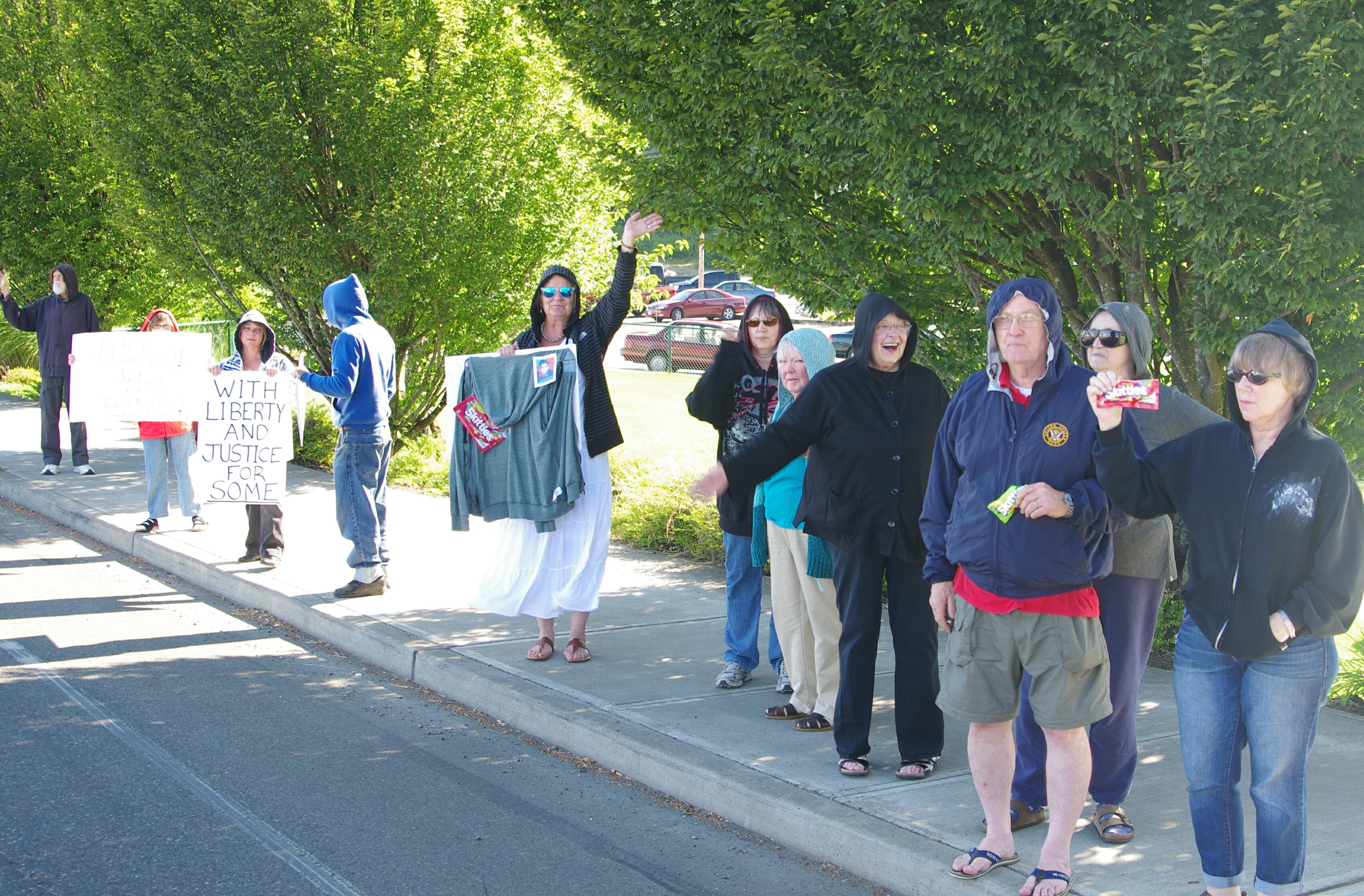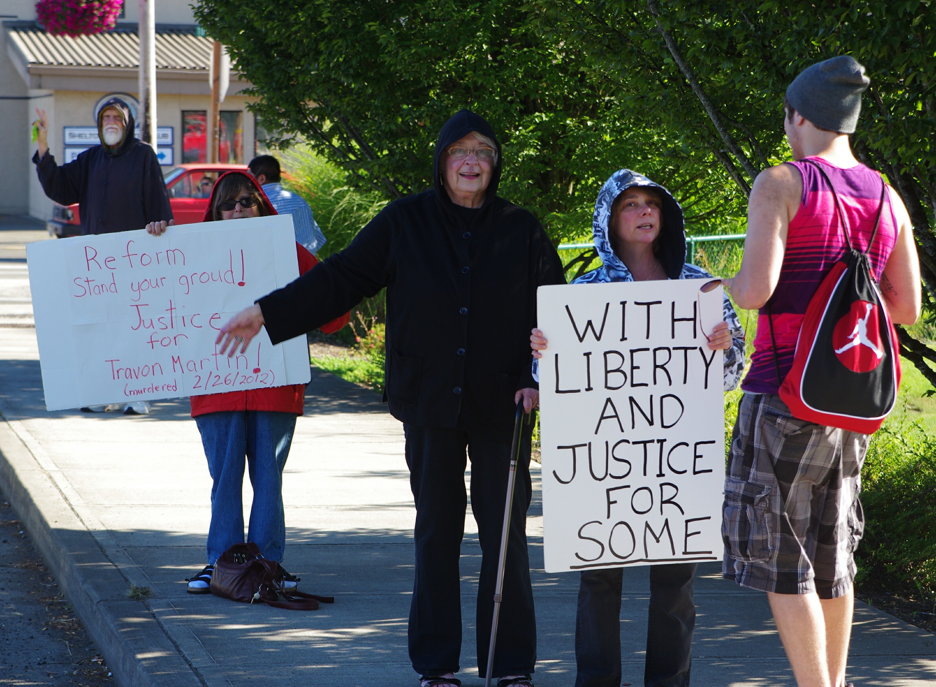 A small (~12) group of activists rallied by Kneeland Park in Shelton today just after the 5:00pm rush hour traffic and daily train blockade on 1st Ave. They looked a little tired and long in the tooth, closely matching Mason County’s demographics. i.e. retired senior citizens passionately opposed to the suspected gratuitous killing of a black teen in Sanford, FL, SYG (stand your ground) laws, and the unannounced carrying of a concealed handgun by citizens intent on monitoring/observing their neighborhoods to reduce crime.