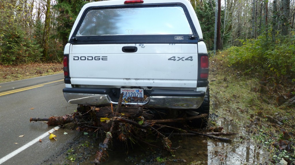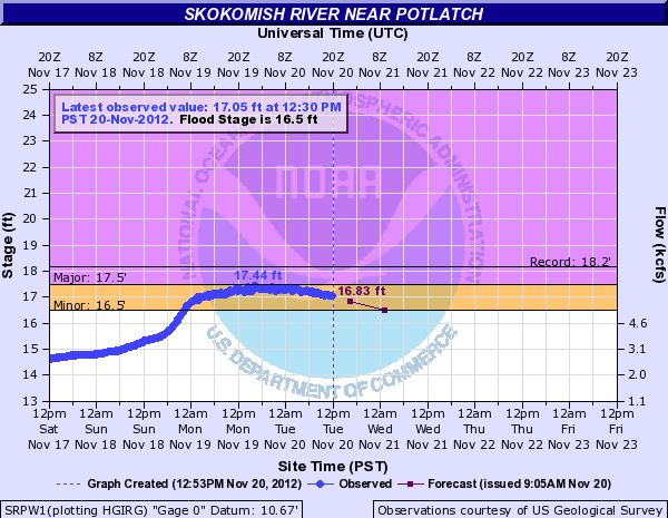 The raging Skokomish River has claimed more property and vehicles this Thanksgiving week, having reached a major flood stage @ 17.43 ft. according to the telemetry of the USGS Potlatch river elevation gauge.