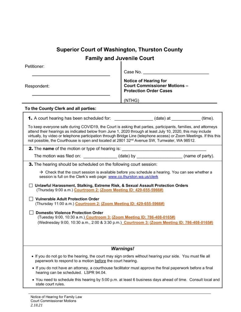 Thurston Family & Juvenile Court Notice of Hearing for Motions – Protection Order Cases